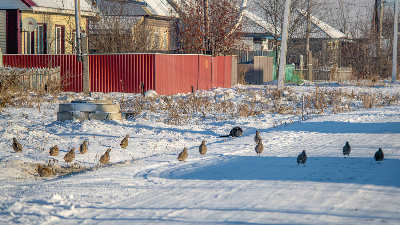 2025-11-30. Владимир Маер: (-1-)Стайка куропаток спокойно гуляла по улице. Пока мы их снимали, из двора дома вышел местный кот, который, судя по всему, был в шоке от их наглости. Настолько, что даже не попытался их изловить. 2025-12-01. Oльга Фаттахова: (-1-) Владимир, фокус был сделан на кота, надо было выбрать опцию "серый кот")) Прикольный кот! Видать никогда не пробовал куропятины. 2025-12-01. Владимир Маер: (-1-) Ольга, так то кот деревенский, курятину в виде остатков с людского стола отведывал не раз, скорее всего. Да и птиц, думаю, много ловил. Но с такими большими растерялся... 2025-12-01. Александр Нефёдов: (-3-) Ну да - большие, много и окружают ... 2025-12-02. Игорь Фефелов: (-3-) О, вспомнил рассказ сельского знакомого. Однажды выходит он зимой в свой огород - а это крайняя улица, за огородами уже околица и за нею выгон, потом поле и всякое прочее, - и видит в огороде стаю бородатых куропаток. Когда он зашел в огород, они взлетели и со своеобычным верещанием низенько полетели от него в поля через забор (глухой дощатый). А на заборе в это время сидел соседский кот - наверно, ходил на охоту за щеглами и прочими птичками, он, говорят, постоянно их на двор таскает, иногда съедает, иногда просто оставляет. Щеглы там как раз копошились на подсолнухах и репьях, а кот за ними наблюдал. Вдруг внезапно выскочили куропатки и полетели точно на него! Кот, говорит рассказчик, даже не соскочил с забора, а прямо-таки свалился с него на ту сторону - можно сказать, куропатки его сшибли. 2025-12-04. Михаил Белоусов: (-3-) У меня кот бывает и сорок с воронами скрадывает.Ловил или нет не знаю, но попытки были. 2025-12-04. Михаил Белоусов: (-3-) Бекас и коростель в жертвах точно числятся.