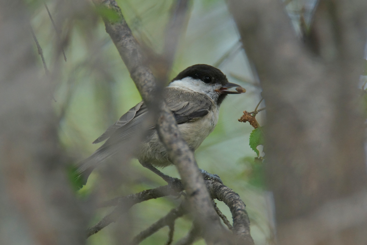 Белая полоска вдоль линии смыкания клюва характерна для пухляков. Но иногда отсутствует. А пятнышко вместо полоски характерно для черноголовых гаичек. Но иногда отсутствует, иногда выглядит как полоска.