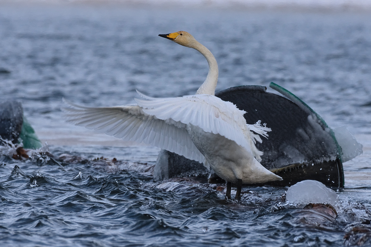 2026-01-04. Ольга и Александр Немежиковы: (-1-) Поведение лебедя удивительно! Пока мы со всеми предосторожностями по глубокому снегу подбирались к кормящейся птице, таясь за деревьями и сугробами, к лодочной станции, что буквально в 30 метрах от лебедя в реке, подъехала машина, которую встретила стая взбесившихся, полагаем, от радости, огромных бездомных псов. Лай стоял невообразимый, потому что псы эти рьяно взялись и нас изгонять с кормовой территории. (Но палки в руках их отрезвили, да и обеда они заждались.) Не успели мы мысленно попрощаться с возможно улетающей птицей, как обратили внимание, что по мосткам лодочной станции над водой ходят ...люди, а это всего-то в метрах 20 до лебедя! Он, как ни в чём не бывало, занимался своим бытом возле заваленных набок буйков мелководья: кормился, хлопал крыльями, активно чистился, а в конце нашего наблюдения (минут через 30) и вовсе устроился отдыхать - задремал, уложив голову на спину. Ни собаки, ни люди не потревожили его покоя, мы тоже вволю нафотографировали птицу с берега, от кромки льда, совершенно не прячась. Такой пофигизм среди пернатых редко встречается. 2026-01-04. Игорь Фефелов: (-1-) Шансы есть, но собаки непредсказуемы, и не знаю, хватит ли ему водорослей, не понадобится ли подкормка. Если там заросли элодеи есть, то должно хватить. 2026-01-04. Ольга и Александр Немежиковы: (-1-) Спасибо, Игорь! Чем лебедя можно подкормить и каким образом? И не опасно ли ему совсем перед людьми страх потерять? Мы, как раз, подумали, что в данном случае собаки неплохо защищают лебедя, не подпуская к берегу случайных зевак - на станции их явно подкармливают, используя как сторожей. Уж очень маловероятно, что собаки полезут за лебедем в обжигающе ледяную и реально стремительную воду. Элодея у нас повсюду, в этом месте речную траву явно не выкашивают, как возле человейников - там стогами за лето выносят. Нас больше мороз волнует: сможет ли лебедь выдерживать длительный холод под минус 20 с ветром до штормов, ведь на воде стужа дикая в такую погоду. 2026-01-04. Игорь Фефелов: (-1-) Комбикорм для домащней птицы, пареные зерновые. Элодея, наверно. не очень калорийна, поэтому с учетом холодов ему ее надо очень много. 2026-01-04. Игорь Фефелов: (-1-) Если умные, то могут к нему и не полезть - опасно. Но вот регулярны случаи, когда они, наоборот, наносят зимой лебедям травмы. 2026-01-04. Ольга и Александр Немежиковы: (-1-) Спасибо, Игорь! Будем надеяться на лучшее, ведь перезимовал же в Красноярске белолобый гусь зимой 2019-2020 гг.! 2026-01-12. Надя Гончарова: (-1-) Собаки - это сторожей. Они облаивают людей, на лебедя им плевать. В ледяной Енисей лезть - такое себе. Тем более лебедь летает, я общалась со сторожами. Подкормка птицу не интересует, на собак ей глубоко пофигу. Главное, что лебедь пережил новогоднюю ночь! 2026-01-12. Игорь Фефелов: (-1-) Если лебедь их не интересует, это очень хорошо. 2026-01-13. Сергей Л. Волков: (-3-) В Приморье на заливе Владимира в декабре держался лебедь-кликун, который чуть ли не с рук ел. Местные по непонятной причине решили, что у него сломано крыло (на всех доступных мне фотографиях птица выглядела вполне здоровой), создали даже группу охраны и помощи, требуя отловить и спасти птицу. А потом он исчез, скорее всего улетел. 2026-01-13. Надя Гончарова: (-3-) Перегибы это всегда плохо, но лучше так, чем - поймали, сожрали... У нас 2 января звонили заместителю директора по охране по повод