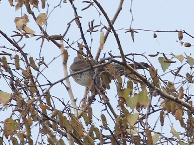Один среди буро-рыжих дроздов затесался, выделяясь по размеру. Были еще рябинники, но в своих группах