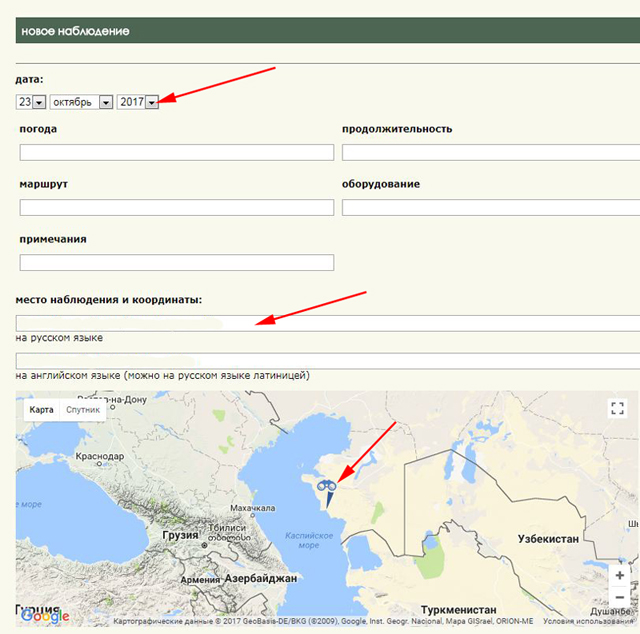 Π ΠΎΡΠΊΡΡΠ²ΡΠ΅ΠΌΡΡ ΠΎΠΊΠ½Π΅ Π·Π°ΠΏΠΎΠ»Π½ΡΠ΅ΡΠ΅ Π½Π΅ΠΎΠ±Ρ ΠΎΠ΄ΠΈΠΌΡΠ΅ Π³ΡΠ°ΡΡ (Π΄Π°ΡΠ°, ΠΌΠ΅ΡΡΠΎ Π½Π°Π±Π»ΡΠ΄Π΅Π½ΠΈΡ ΠΈ ΠΊΠΎΠΎΡΠ΄ΠΈΠ½Π°ΡΡ Π½Π° ΠΊΠ°ΡΡΠ΅), Π΄ΠΎΠΏΠΎΠ»Π½ΠΈΡΠ΅Π»ΡΠ½ΠΎ Π²Ρ ΠΌΠΎΠΆΠ΅ΡΠ΅ ΡΠΊΠ°Π·Π°ΡΡ ΠΏΠΎΠ³ΠΎΠ΄Ρ Π½Π° ΠΌΠΎΠΌΠ΅Π½Ρ Π½Π°Π±Π»ΡΠ΄Π΅Π½ΠΈΡ, ΠΌΠ°ΡΡΡΡΡ, ΠΏΡΠΎΠ΄ΠΎΠ»ΠΆΠΈΡΠ΅Π»ΡΠ½ΠΎΡΡΡ Π½Π°Π±Π»ΡΠ΄Π΅Π½ΠΈΡ ΠΈ ΠΈΡΠΏΠΎΠ»ΡΠ·ΡΠ΅ΠΌΠΎΠ΅ ΠΎΠ±ΠΎΡΡΠ΄ΠΎΠ²Π°Π½ΠΈΠ΅.