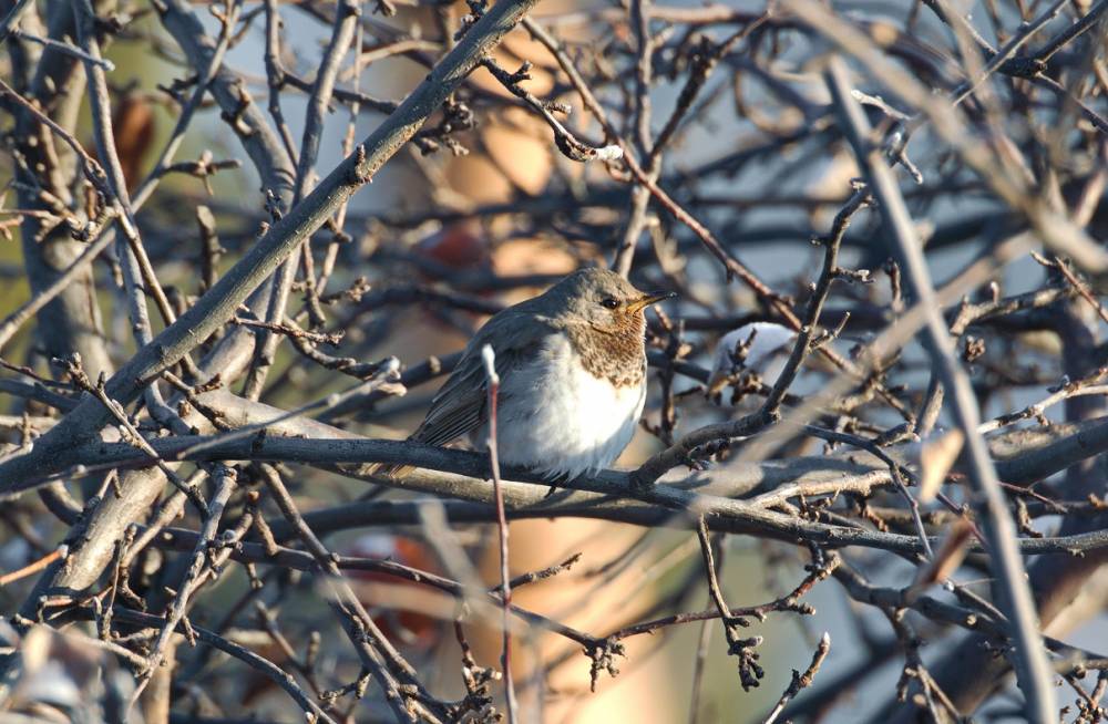 Сегодня удалось отснять всего три вида, так как был мороз и ветер. Дубоносы (3 шт.) кормились замороженными яблоками, большие синицы (примерно 25-30 шт) весь день на сале и семечках. Чернозобые дрозды (4 шт.) на вершинах больших яблонь.