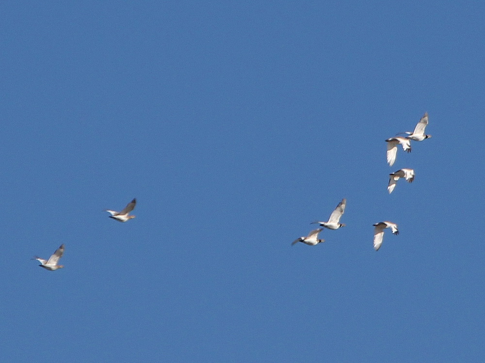 2е вдхр. Три плясуньи, две плешанки и полевой жаворонок, а также сотенные стаи грачей и скворцов кормятся в низкой зеленой траве. Грачи и скворцы иногда дружно взлетают и становятся издалека похожими на стаю мошкары. На воде: многочисленны лысухи, бакланы, хохотуньи + 4 кликуна, 3 кудрявых пеликана, серые утки. Со стороны 3го водохранилища были слышны выстрелы, а вслед за звуками выстрелов прилетали стаи бакланов и уток (в основном серых и крякв). Дав круг, утки и бакланы улетали обратно, а после следующих выстрелов опять прилетали. Разума у птиц нет, есть осторожность, но иногда нет и осторожности. Другие птицы: взрослый белохвост, горные овсянки (7-8 птиц), камышовые овсянки, первые в этом году теньковки, пустельга, черноголовый хохотун, пеганки, огари, большие белые цапли, отдельно следует упомянуть курганника на гнезде, обе птицы из пары держались вблизи гнезда. Обедали у озера вблизи лесополосы, здесь к списку добавили свиязей, а сфотографировали пару болотных луней.