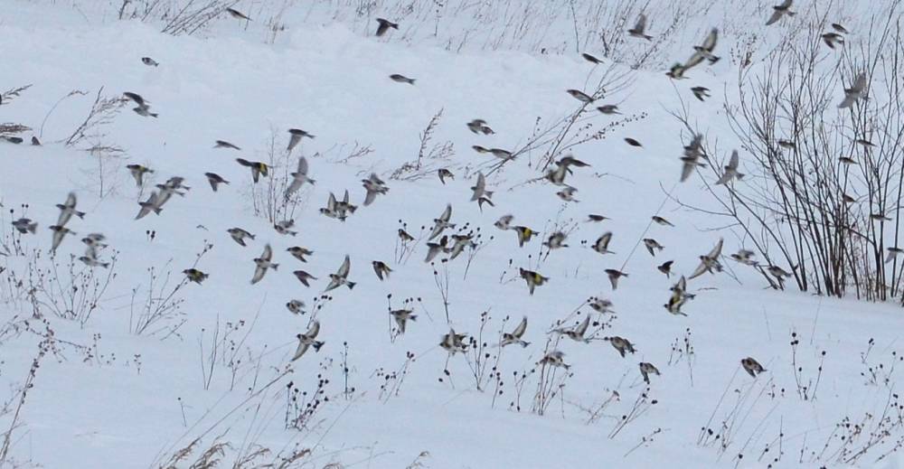 Большая суббота декабря пришлась на 31 декабря. Мело. Птиц было мало. По обочине носились пухляки, но быстро спрятались в соснах. В лесу стучали дятлы, больших пестрых дятлов было 5 на коротком участке около километра. Сороки ветром тоже были не довольны. В поле большой испуганной стаей (больше 30 особей) носились щеглы. Снегири делали вид что ветер им нипочем. Вечером, ближе к 6, метель слегка утихомирилась, урагусы решили покормится в бурьяне полыни, но их уже было не сфотаграфировать.