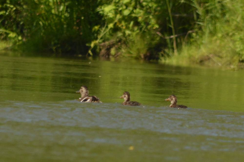 Встретили два утиных семейства. Первое сразу ушло под воду и в камыши. Второе спасалось бегством. Мать уводила нас от потомства, а утята прятались по одному у берега. Когда все утята оказались за кормой, кряква перелетела назад к семейству.