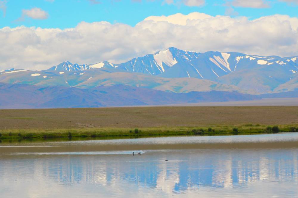 22. За Кош-Агачем между озерами и горами раскинулась Чуйская степь. Она довольно пустынна. А вот в озерах масса птиц. В этом я увидел семейство гагар.