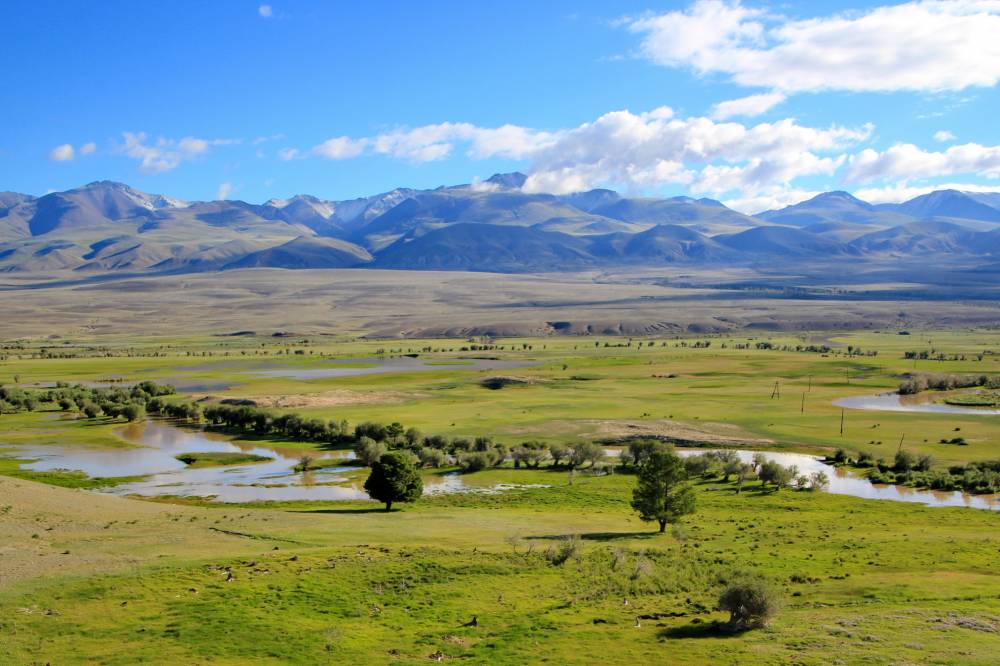 2. Утром выехали посмотреть окрестности. Чуя с участком заболоченной местности, вокруг Чуйская степь, ограниченная горами. На горизонте - Южно-Чуйский хребет.