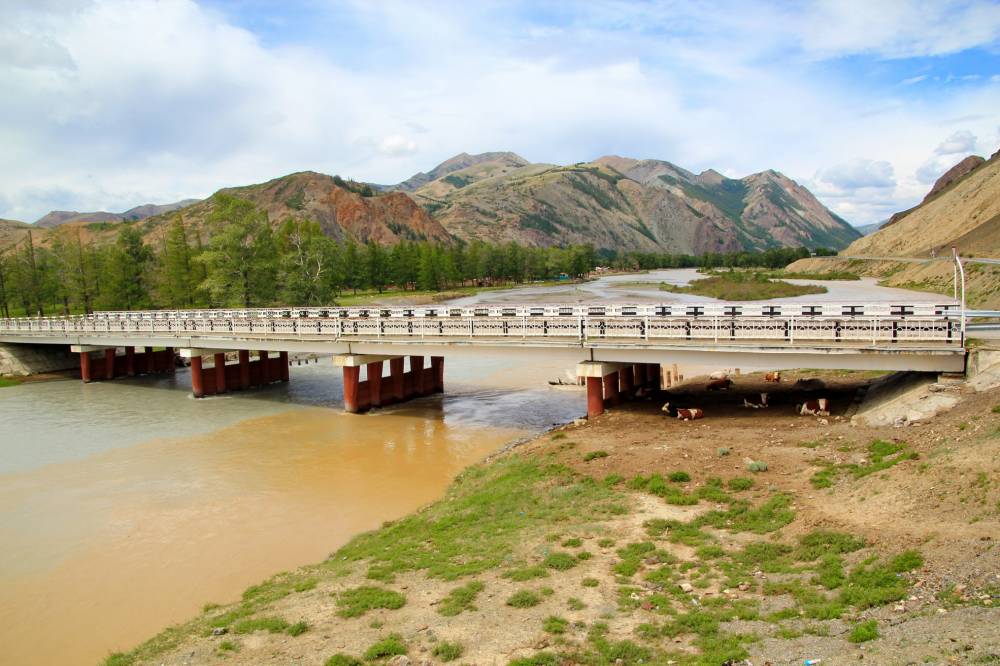 29. Возвращаемся в лагерь через мост в Ортолыке. Чуя прямо красно-коричневого цвета, хотя обычно она здесь прозрачная. Говорят, где-то вверху недавно сошел сель..