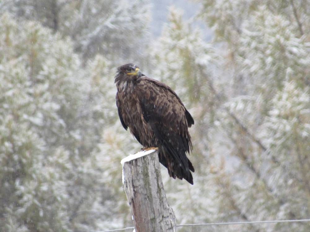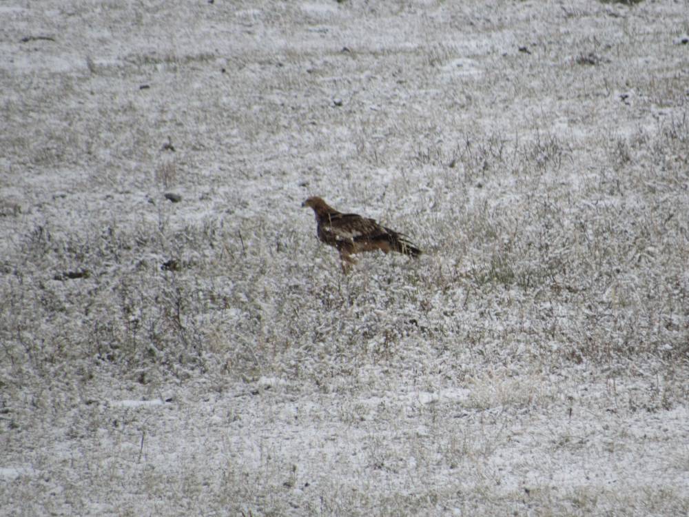 На Семинском перевале шел снег, вокруг все было как настоящей зимой. На нескольких столбах сидели заснеженные птицы, определить их было невозможно. Внизу потеплело, снег закончился. Удалось снять обыкновенную пустельгу, степного орла (возможно большого подорлика). Поскольку я начинающий бердвотчер, то существует проблема с определением птиц. Буду рад помощи. В районе с.Онгудай сфотографировал степную пустельгу, могильника и орла-карлика.
