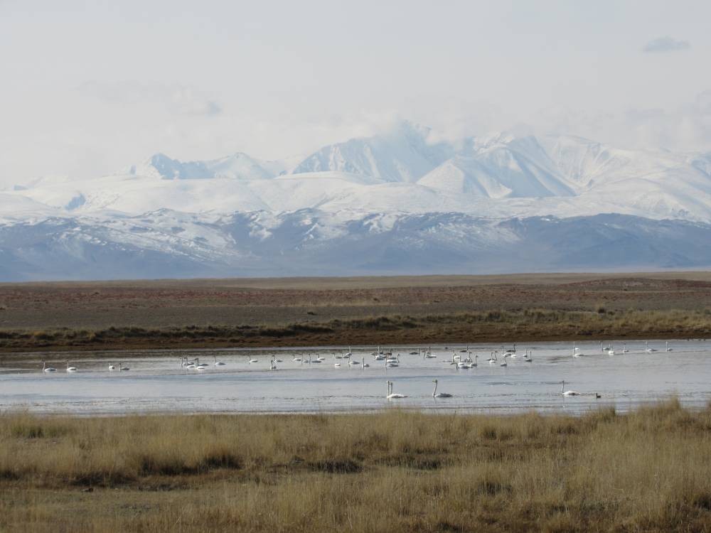 30 сентября с утра была замечательная погода и время для съемок. На соседней с гостиницей крыше сидели скальные голуби. Через 50 м. на небольшой речке было множество шилохвостей и огарей. Затем отправился на озера в окрестностях Кош-Агача. По дороге удалось проследить куда приземлялись табунки лебедей-кликунов и достаточно близко подобраться к реке. Минут тридцать получал удовольствие от чудесного зрелища – около 150 лебедей отдыхали, взлетали, приземлялись, галдели. Рядом было много уток.