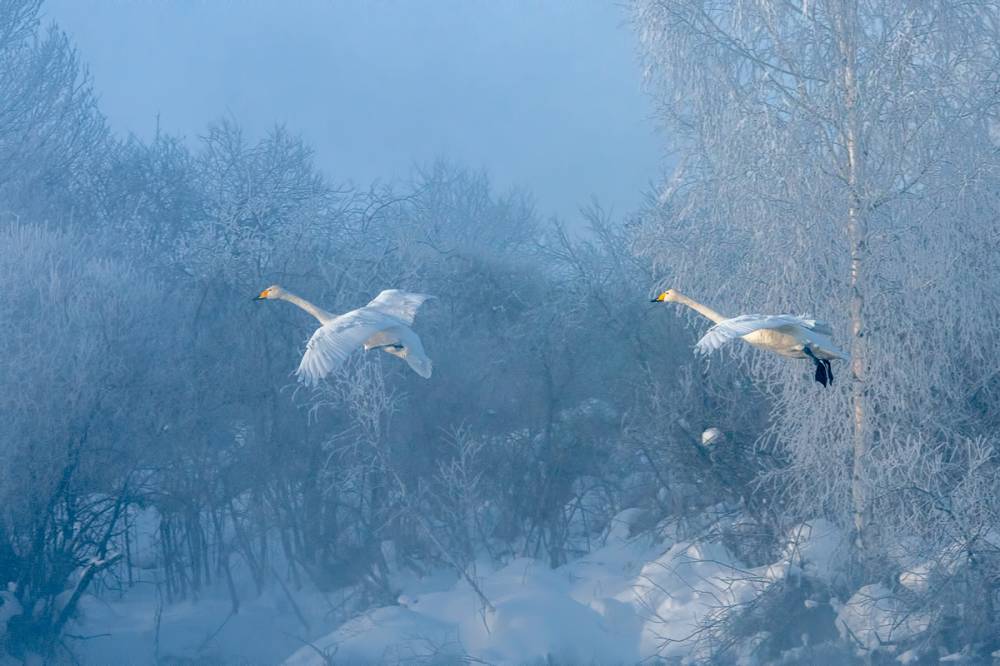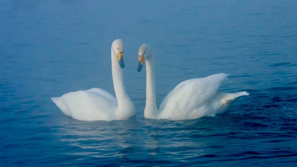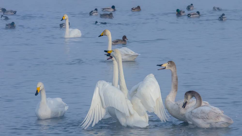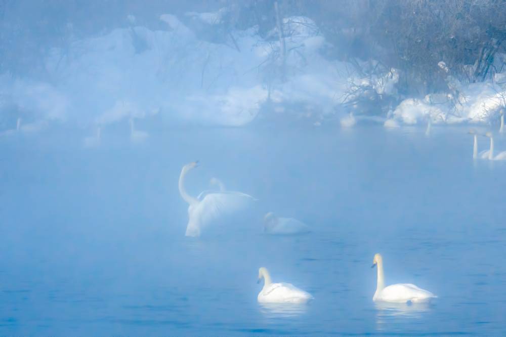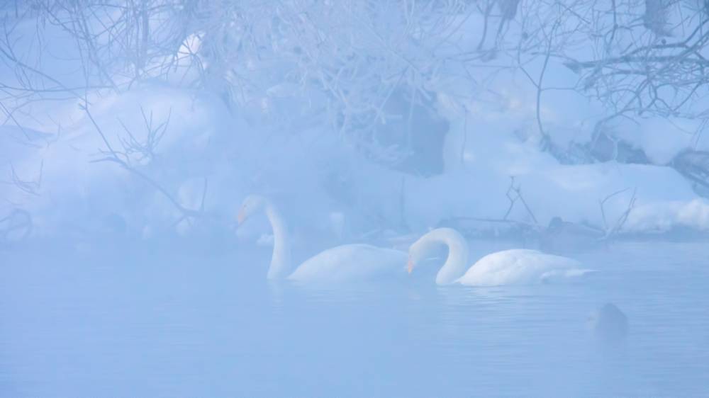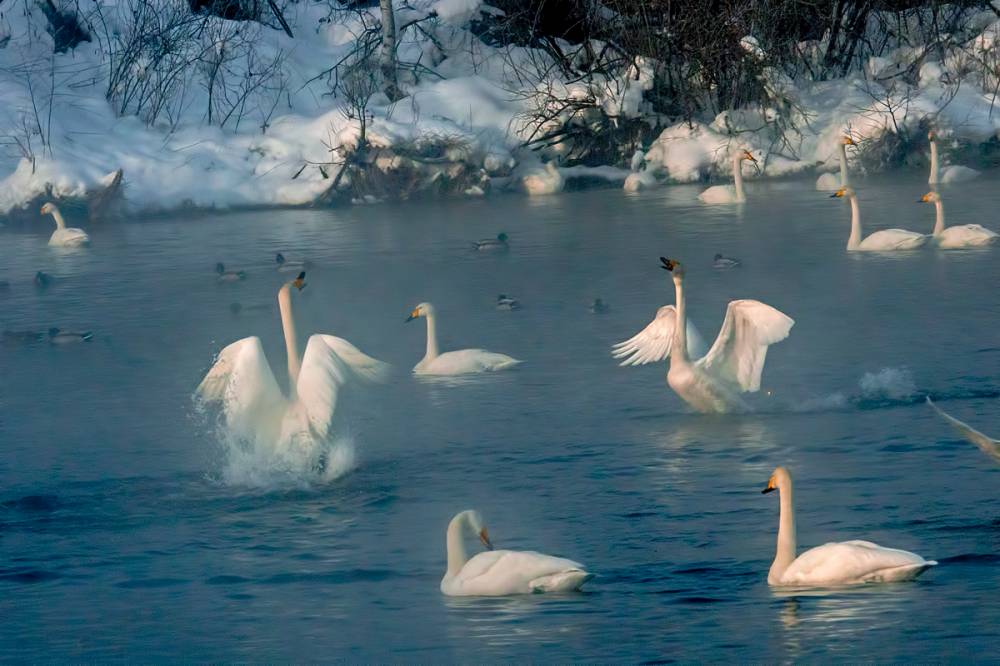 А в это время из-за облака пара, как призраки, выныривают небольшие стайки лебедей, которые ночевали на окрестных речках. Им тоже хочется поесть овса с пшеницей. Имеют на это полное право, между прочим! Не зря ведь остались в Сибири, не полетели зимовать на чужбину. Дома лучше.