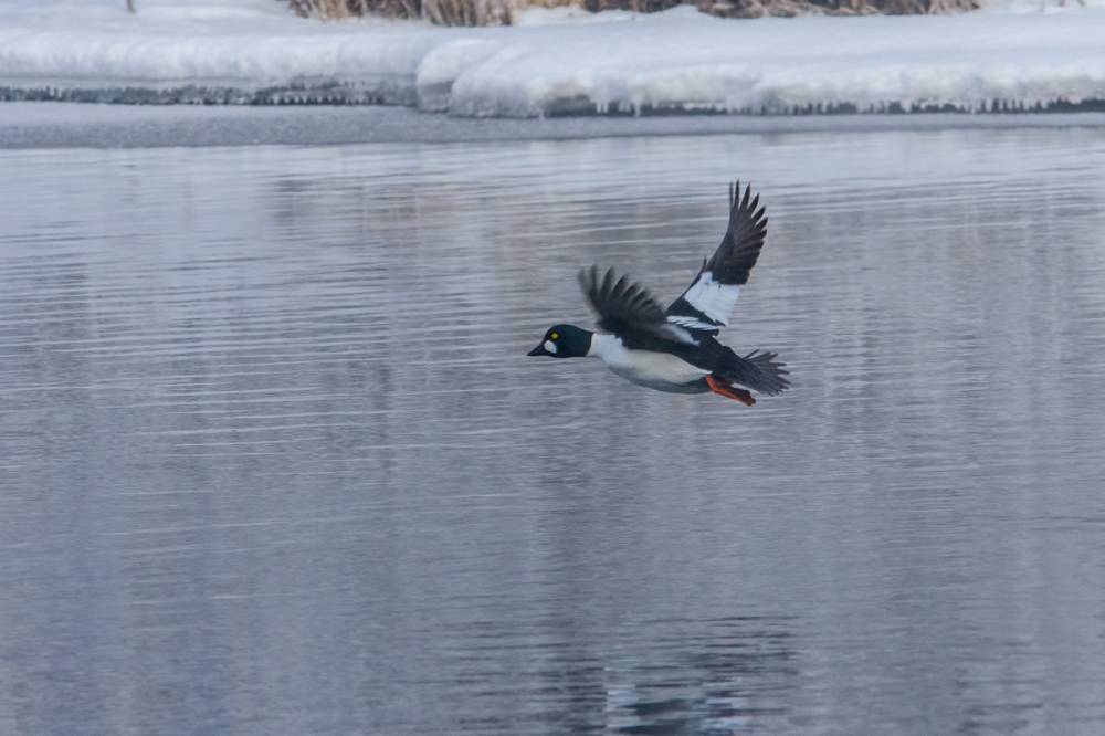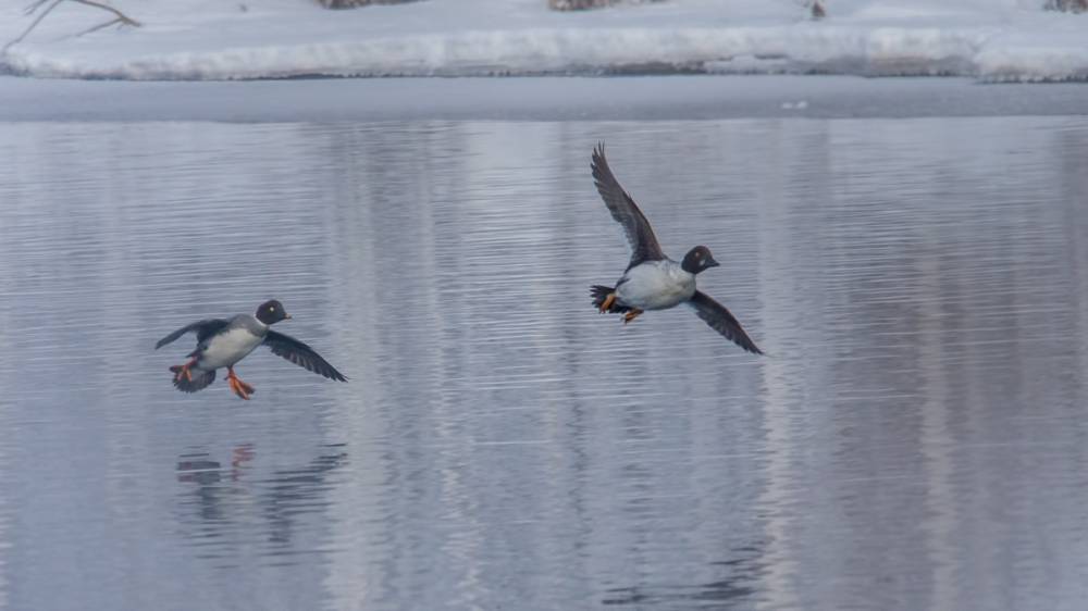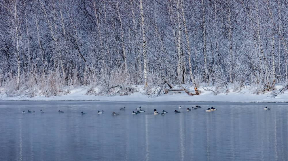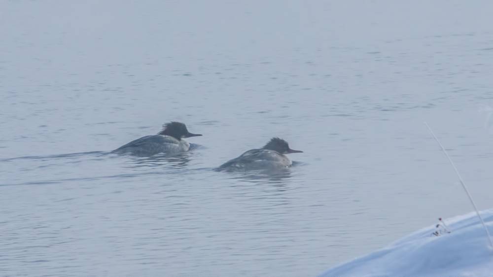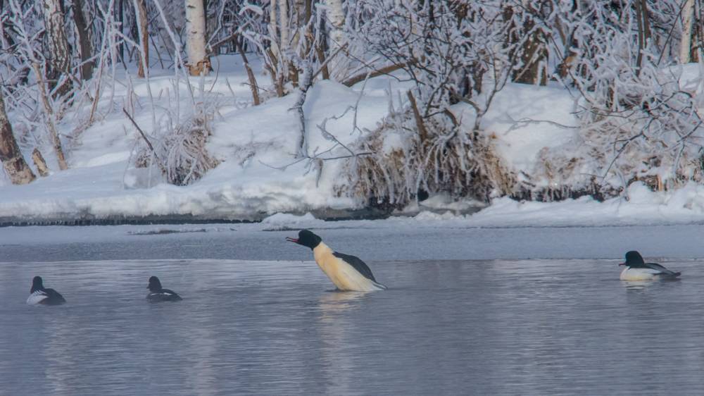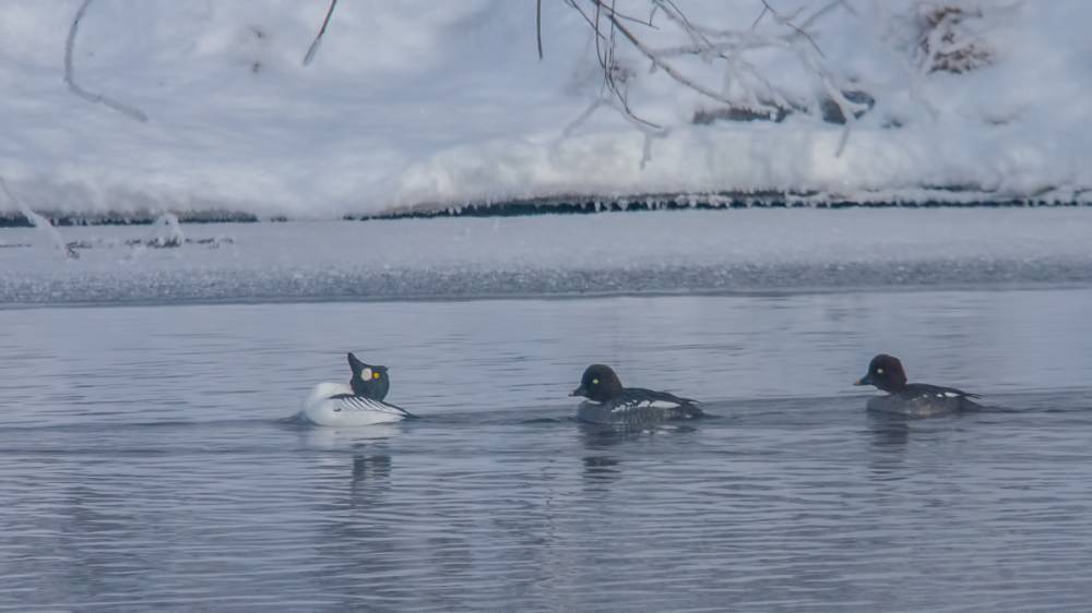 Мы уже замёрзли, поэтому через некоторое время собрались, и поехали дальше по своему маршруту. На выезде из села, прямо с дороги отснял парочку больших крохалей, пару гоголей, молодого одиночного кликуна. Дальше больше- ещё три кликуна дремали, спрятав головы под крылья, даже не сделав попытки уплыть от меня. Стайка крохалей и гоголей активно тусили ближе к дальнему берегу. Самцы гоголей уже токовали, совершая своеобразные движения головой, красуясь перед коричневыми самочками.