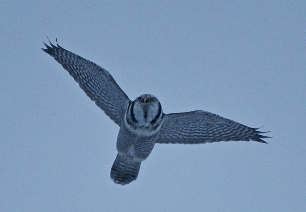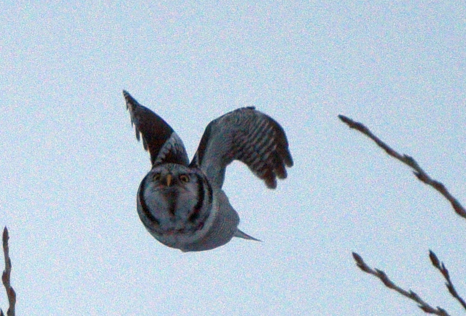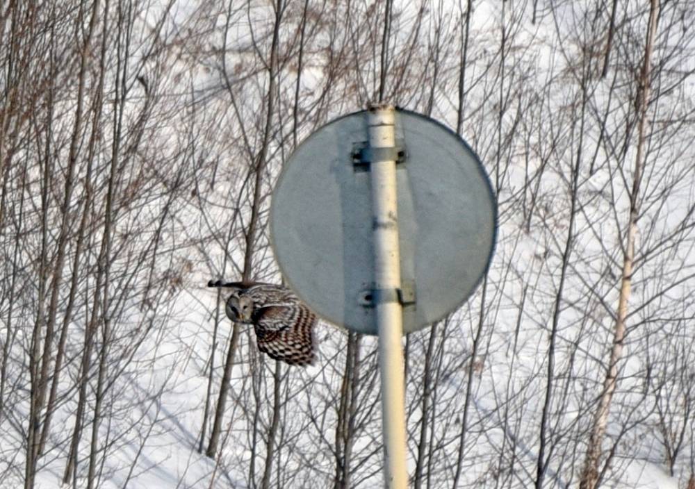 Вечером 24 февраля доехали до села Парная, на берегу озера. Солнце валилось в муть. Увидела ястребиную сову, пришлось поднимать ИСО при съёмке. Сова сидела на столбе, я подошла ближе, и она спикировала прямо на меня. Пронеслась прямо над головой.