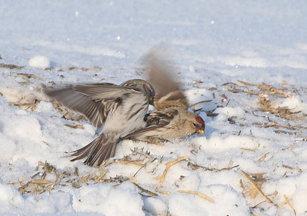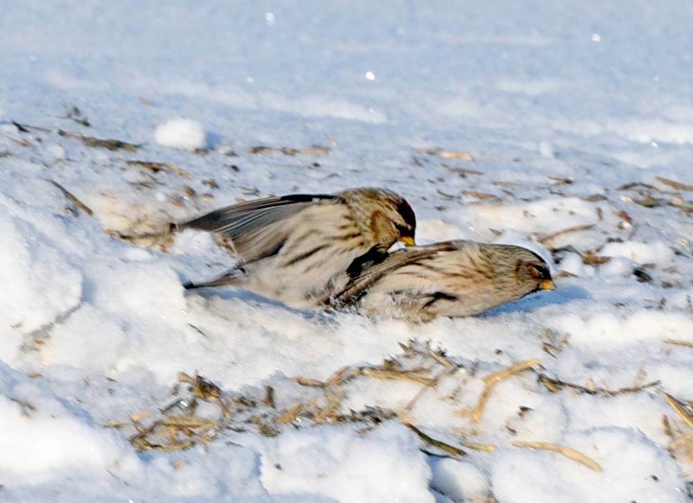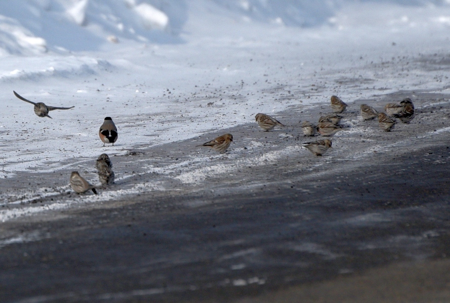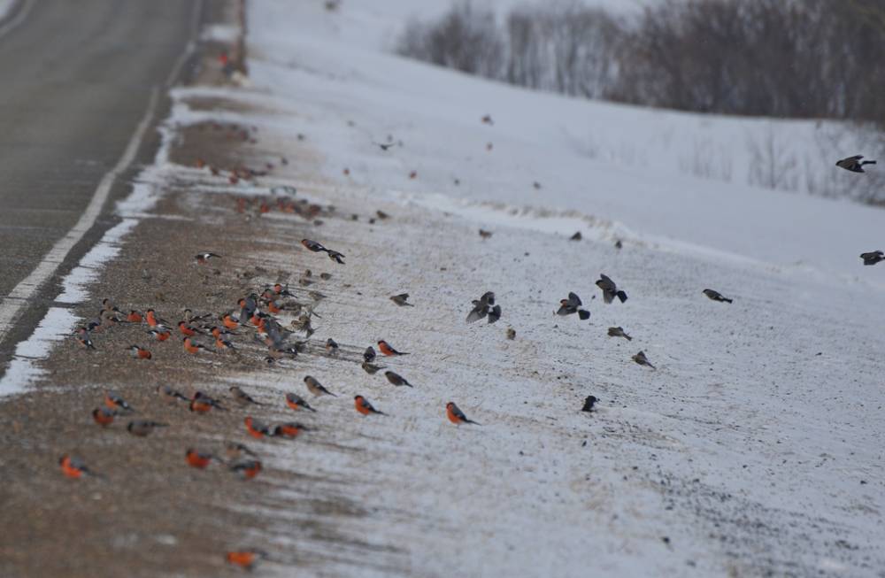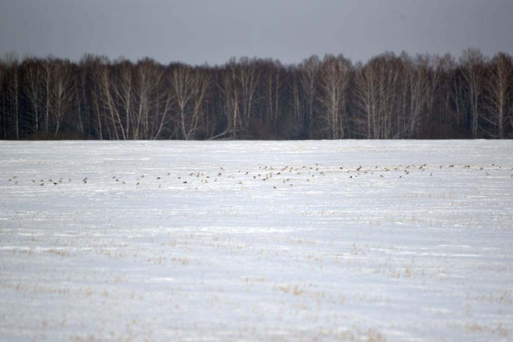 Многие птицы сбиваются в большие стаи. Не поленилась посчитать пуночек в одной из таких стай, получилось 106 птиц. Вдоль дороги от Верх-Чебулы до Тисуля огромные стаи снегирей и смешанные стаи из чечёток, щеглов, урагусов, снегирей.