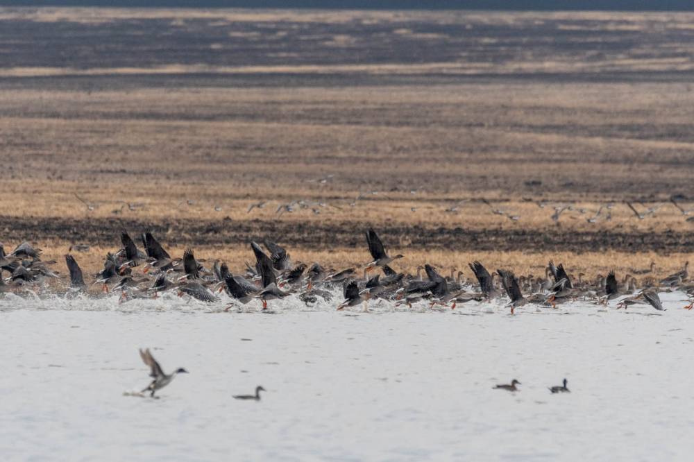 Сел за руль около 5 утра, и через 40 минут был уже на озере Салбат. Именно здесь происходит миграция гусей. На этот раз их было 4 стаи по несколько тысяч в каждой. Озеро и прилегающие к нему лужи подходят практически впритык к дороге с обеих сторон. Гуси пугаются каждого шороха, и стараются слинять при первом же подозрительном шорохе. Ставлю машину в дальнем конце от луж, попутно снимая хохотунов, малого лебедя и взлеты стай гуменников, надуваю засидку и иду в воду. Не успеваю пройти и половину пути до противоположного берега, где успокоившиеся гуси сидят на берегу, начинают гонять по дороге военные грузовики, и гуси вновь срываются с места и перелетают к дальним колкам. Тут еще обнаруживается, что черпанул воду заброднями и теперь правая нога медленно покрывается инеем. Приходится возвращаться к машине и переодеваться в сухое.