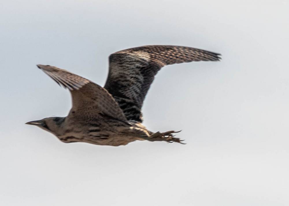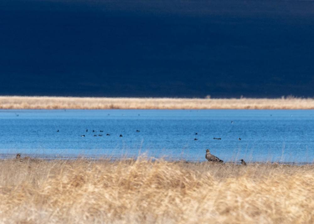 Возвращаюсь на полкилометра назад к границе озера, и пытаюсь в сапогах прогуляться по его берегу вдаль от дороги. Луг залит водой, и сапоги также черпают воду. Что за напасть! Пытаясь сохранить равновесие, шлепаю к небольшому островку , и тут из-под ног выпархивает выпь, хрюкнув при этом так, что сердце падает в район мокрых стелек, а штаны пытаются наполниться непредвиденным содержимым. К счастью, охвативший азарт, нивелирует внезапные физиологические потребности, я втыкаю штатив в мокрый грунт, и успеаю сделать несколько кадров выпи. Её крики будят новую стаю гуменников и одновременно срывают с места степного орла. Еще несколько кадров.