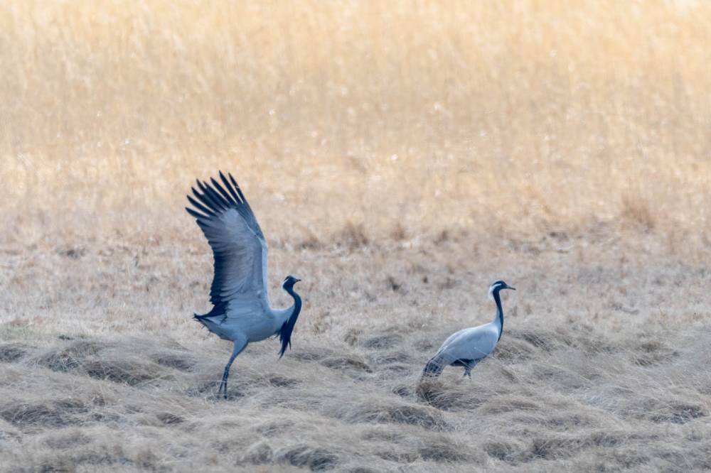 Ночью поднялся сильный ветер. Машину, в которой ночевал трясло во всех направлениях. Запланированная на утро съемка из воды в засидке сама собой отменилась. Не хотелось, чтобы меня, как Элли унесло ветром в соседний регион. Поехал проверять Долину Царей. На берегу Улуг-Коля пара красавок танцевала в воде, на береговой кочке сидел зимняк... всё, пусто...