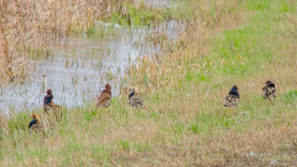 Пеганки попадались достаточно часто. Шесть турухтанов в брачных нарядах паслись возле дороги. Чеглок сидел на камушке, высматривая что-то, изредка удирая от проезжающих машин.