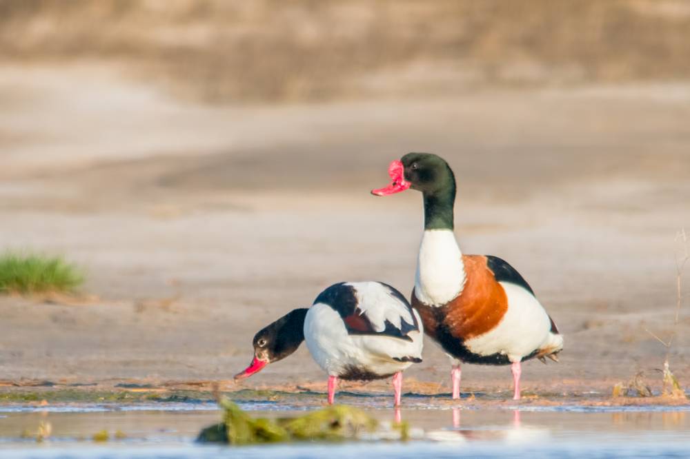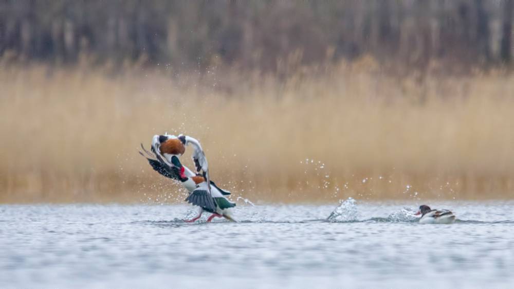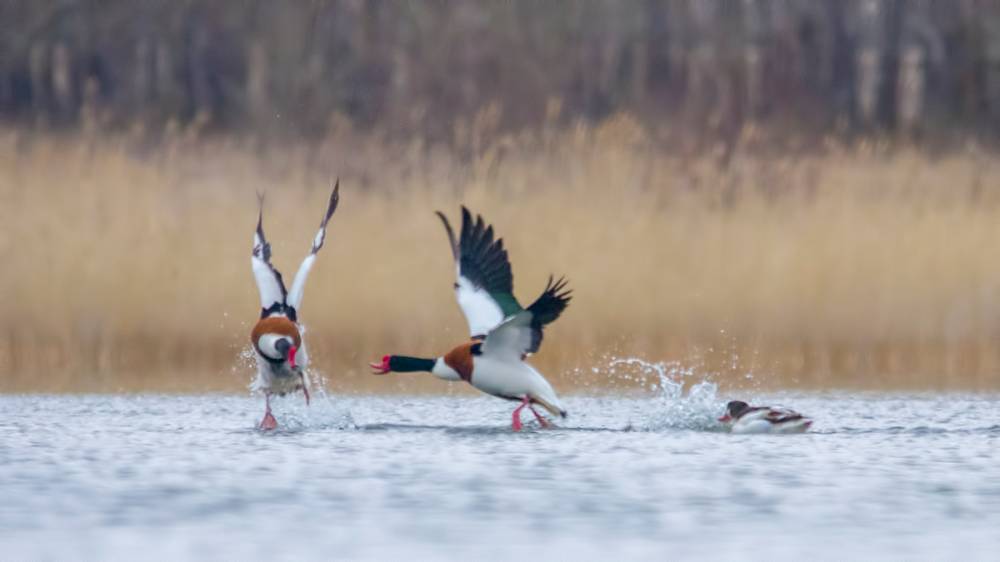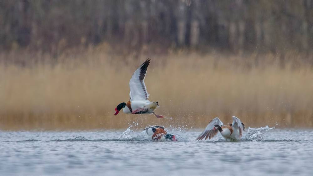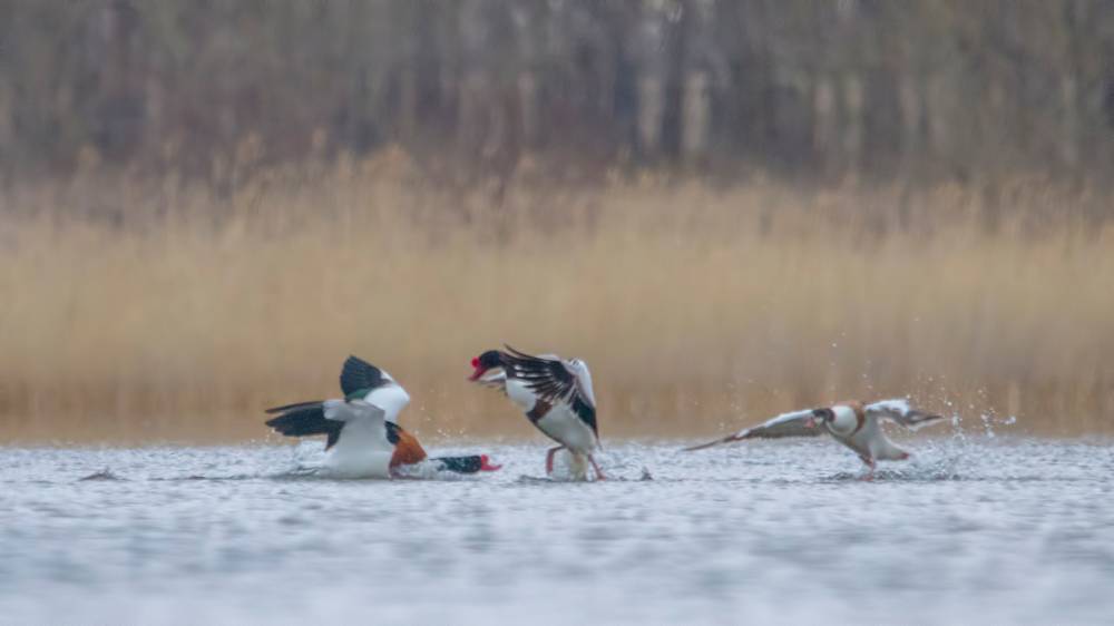 Эх, мне бы приехать пораньше хотя бы на полчаса! Отснял бы с более близкого расстояния драку пары пеганок- хозяев залива с каким-то залётным самцом. То ли он пытался отбить самочку, то ли претендовал на удобный пляж, который обжили мои новые знакомые, но шум они устроили знатный! Хотя, несколько кадров снять удалось, несмотря на большое расстояние и уходящий свет.