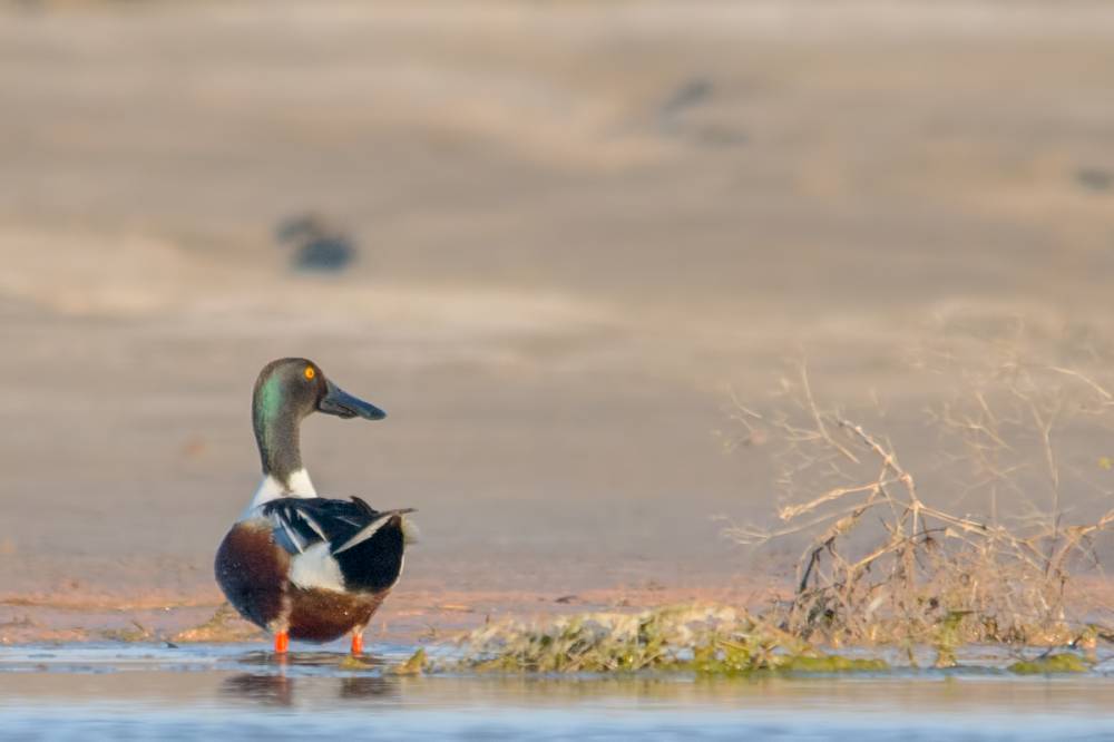 Вот и добрался я до места ночёвки! Благо, палатку ставить не надо, спальник смонтирован в машине. За несколько минут собрал засидку, и в плавание! Пара пеганок на этом берегу, в ста метрах. В соседях у них также пара широконосок. Кстати, широконоски более осторожны, чем пеганки, уж не знаю почему.