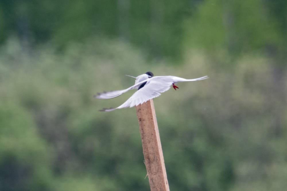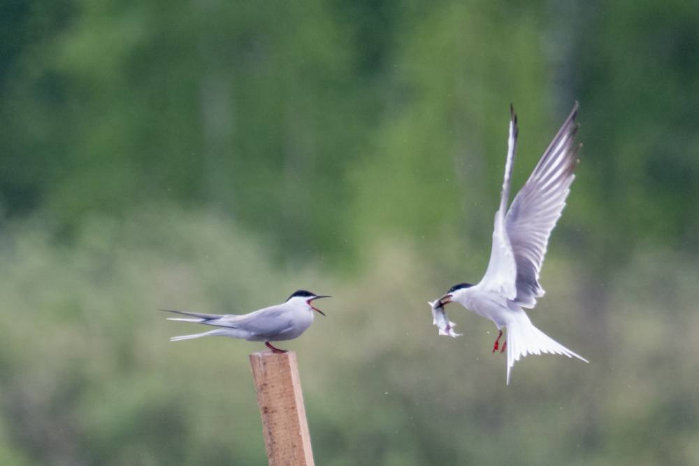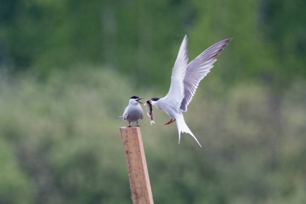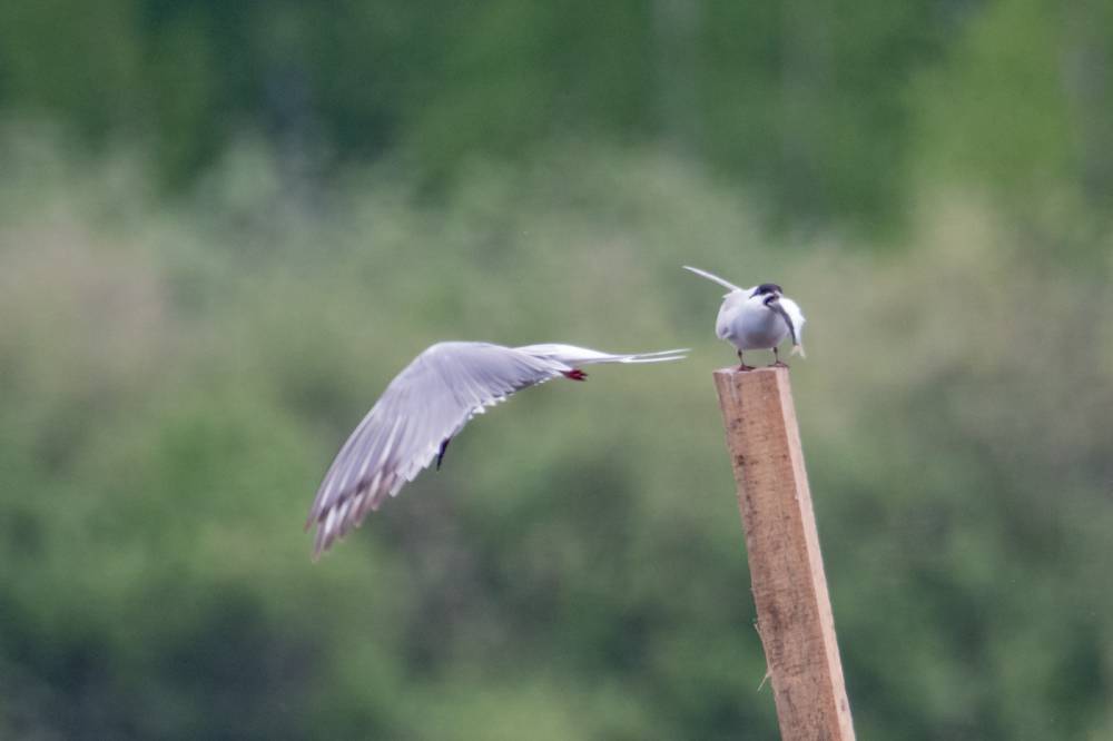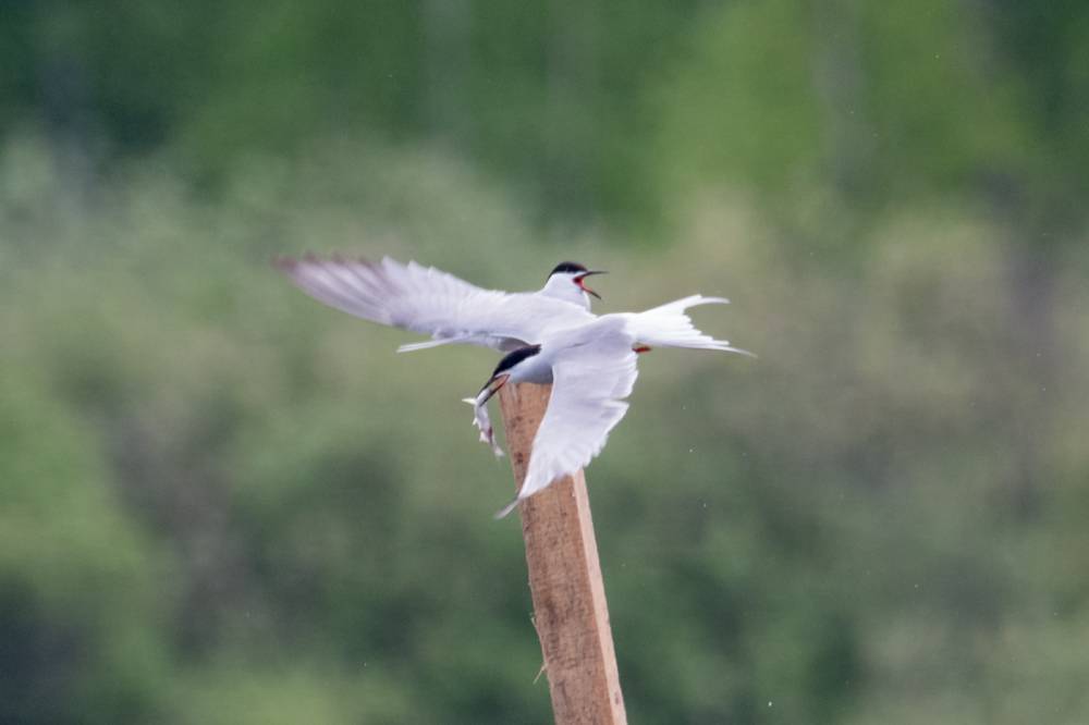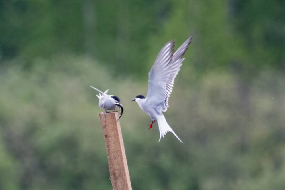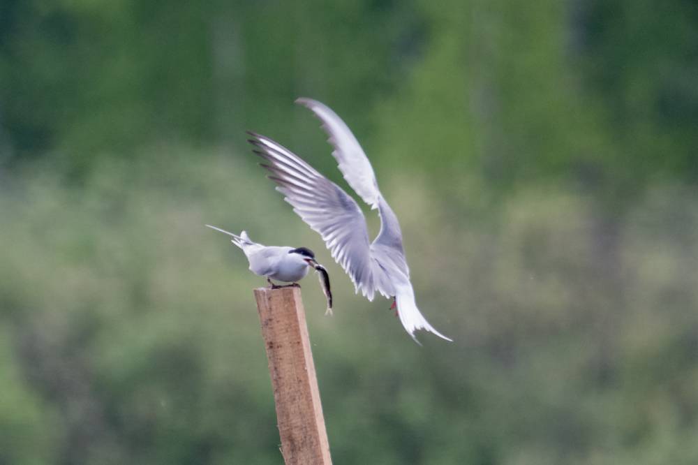На Тургайском озере мы увидели всего 3 речных крачки. Две из них летали над гладью воды и пытались ловить рыбку, а одна предпочитала сидеть на жерде и строить глазки. Одна из летающих индифферентно относилась к окружающей действительности, тогда как вторая выловив рыбку тотчас понес той, что насиживала жердь. Сделав несколько па крыльями и помахав рыбкой перед клювом объекта вожделения, отлетел в сторону, видимо самка не приняла ухаживания и отвергла подношения.