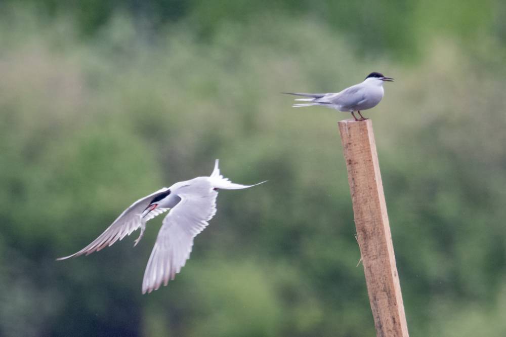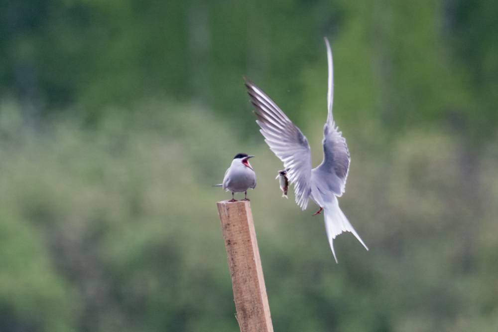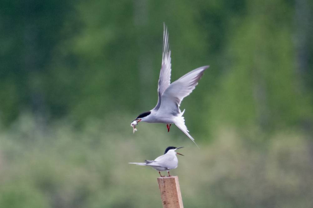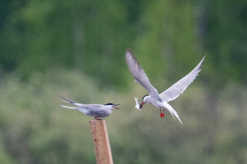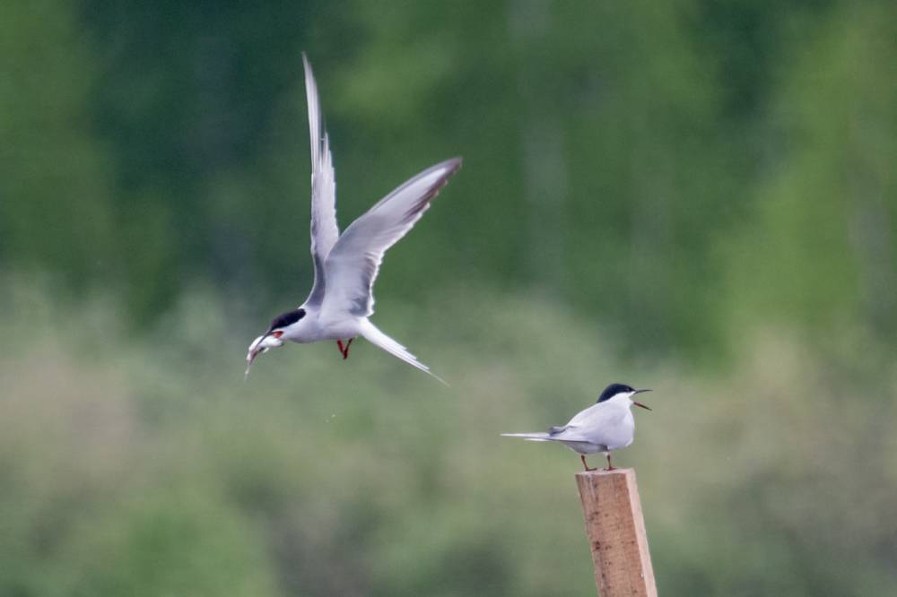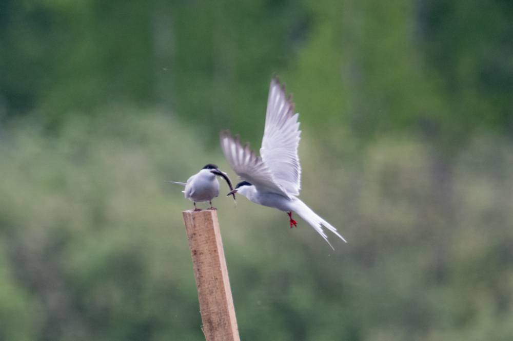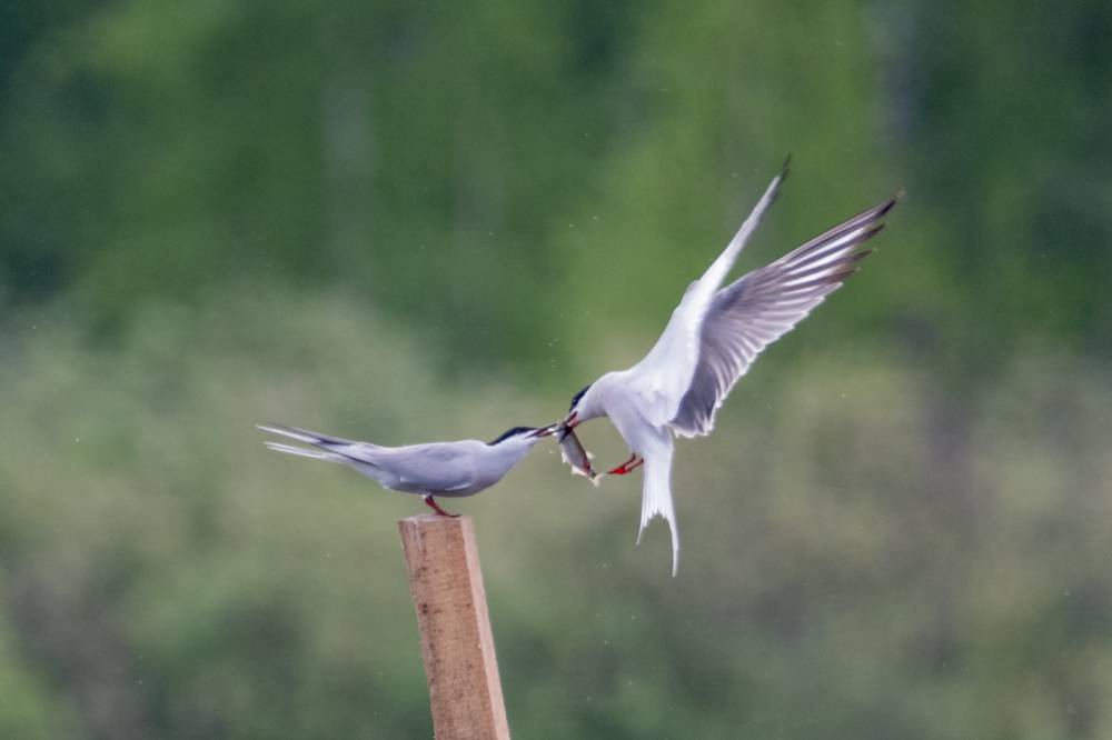 На Тургайском озере мы увидели всего 3 речных крачки. Две из них летали над гладью воды и пытались ловить рыбку, а одна предпочитала сидеть на жерде и строить глазки. Одна из летающих индифферентно относилась к окружающей действительности, тогда как вторая выловив рыбку тотчас понес той, что насиживала жердь. Сделав несколько па крыльями и помахав рыбкой перед клювом объекта вожделения, отлетел в сторону, видимо самка не приняла ухаживания и отвергла подношения.
