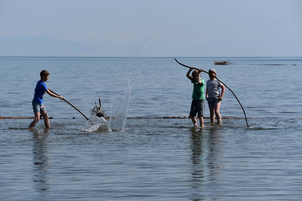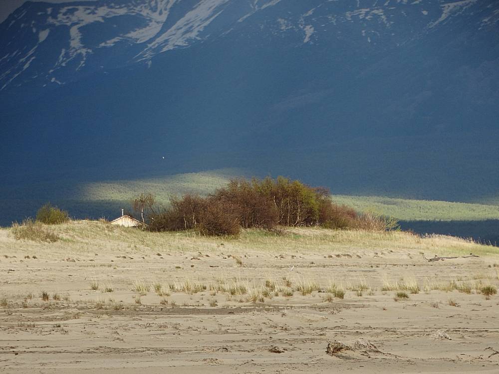 На следующий день мы вышли на лодке в "большой сор". Птиц было много. Крохали, кликуны, кряквы, журавли, тысячи бакланов. На кочках встречались восточные луни. В небе кружили орланы. Мы пробирались к острову Ярки. В конце июля здесь массовый сплав на катамаранах, а вначале июня дуют какие то опасные ветры. Мы пристали к Яркам и в нашем распоряжении был целый остров 150 метров в ширину и около 3х километров в длину. На острове нашлось одно открытое зимовьё . 3 кровати, дрова печка.. всё, как полагается. Было пасмурно. Я с дуру не взяла хорошую камеру , когда пошла исследовать остров. Боялась дождя. В прошлый раз камера у меня отказалась работать на 6 ой секунде. Влажность... Увидела я сотни горбоносых турпанов, несколько десятков свиязей. 19 шилоклювок. Без счёта кулика- воробья, чибисов, чернозобика, чеграву, серых журавлей, лебедей, галстучников, опять же кроншнепов. И тут в сером небе стали появляться просветы. И заходили туда сюда солнечные прожектора, Байкал играл всеми красками. Может и хорошо, что не было со мной камеры, а то бы не налюбовалась. Переночевали и наутро по "сору" отправились дальше. Вышли на новое зимовьё, оно стояло прямо в воде на сваях. Рядом была такая же банька. Но мне не до помойки, по кочкам (чуть ноги не сломала) пошла осматривать местность. Увидела много поручейников, ондатр, бакланов, луней, чёрных коршунов. После обеда мы двинулись в направлении Фролихинского заказника. Местечко называлось Дагары. Там пост егеря и пристать к берегу можно лишь с особым разрешением. У проводника оно было. Дагары представляют собой песчаную косу 7 км , примыкающую к лесу. Местность интересная, похожая на песчаные дюны, заросшие стланником. (особый вид низкорослого байкальского кедра) . Мы вышли из лодки и оба на... всё утоптано медведями. К нам подошёл егерь, его хозяйство находилось в метрах 200 от нашего лагеря. Он нам сказал, что этой ночью из леса вышли 3 медведя и ему пришлось спустить лаек. Предупредил, чтобы мы не ходили по одному, и если собаки лают , значит медведи рядом. И если мы хотим поснимать медведей " ПОЖАЛУЙСТА делайте это с вышки". Рядом с зимовьем стояла 6 метровая вышка. Ха-ха. Не особо то хотелось. Утром я встала раньше всех и побрела в сторону леса, боязливо озираясь. Но так и никого не встретила. Из птиц были поручейники, зуйки, чибисы, краснозобики , кроншнепы. Мелких птиц практически не было. Удивил одинокий скворец. Мы должны были к обеду выйти с Дагар, но начался ветер и нам пришлось заночевать. Утром следующего дня мы отправились к Кичере и тут начались неприятности. Сначала сломался мотор и Илья ремонтировал его полтора часа, потом мы сели на мель, пришлось выходить в студёный Байкал и снимать наш ботик, Потом с воды стала подниматься муха-однодневка. Мух было просто мегатонны. Кормчего нашего не было видно. Пока не подул ветер мы просто объедались этой мухой. И через рот и через нос. Илья сказал, что медведи собирают её на берегах и едят. Оказывается лакомство)). Но на этом наши злоключения не закончились, километра за 2 до Кичеры у нас закончился бензин. Хорошо, что у нас была маленькая вёсельная лодочка и мы смогли заякориться. Илья ушёл за бензином, а мы 2 часа болтались на якоре.