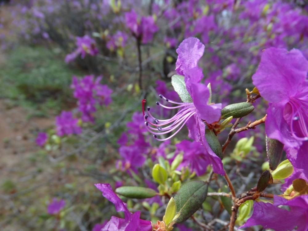 Мы приехали в Северобайкальск 31 мая, был первый "тёплый день". Солнце точно светило во всю мощь. Но северный ветер, не располагал к мыслям о предстоящем лете. Однако местные пацаны во всю плескались в Байкале, в то время как мы задраивали уши шапками-ушанками)). В это время цвёл даурский рододендрон. Зрелище!!! На вид даурский неотличим от ледебуры.