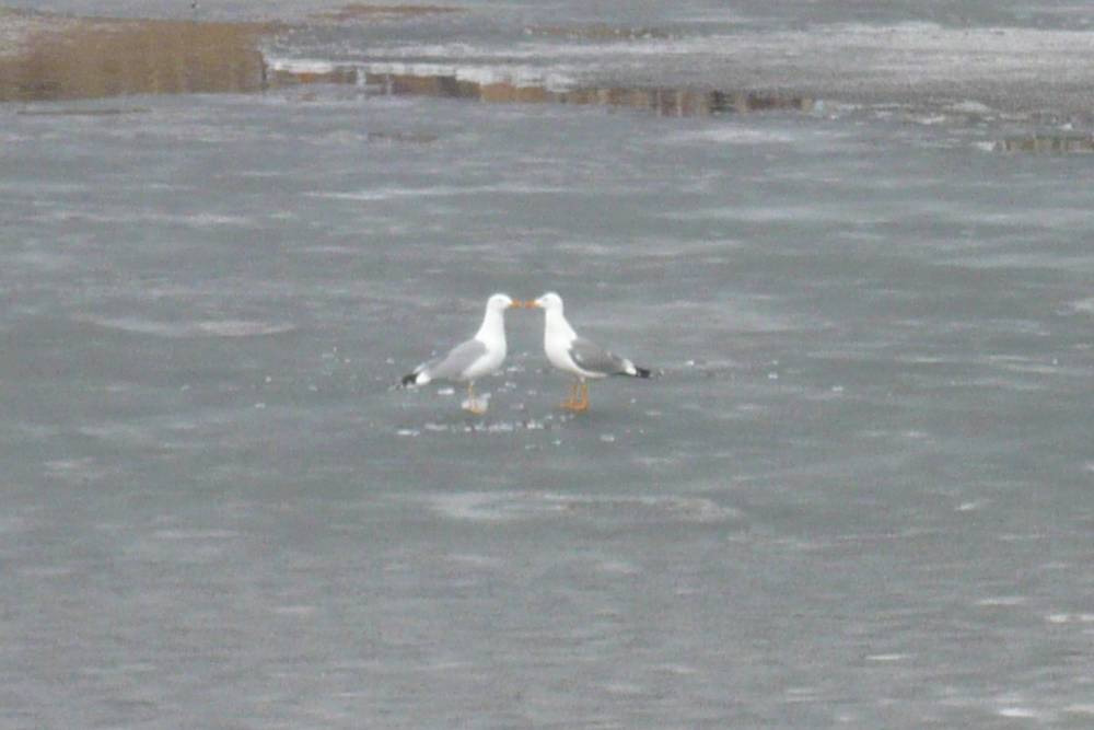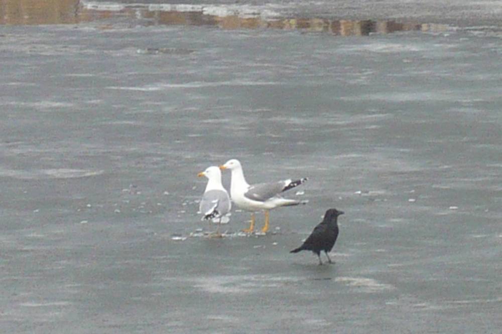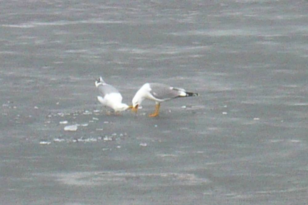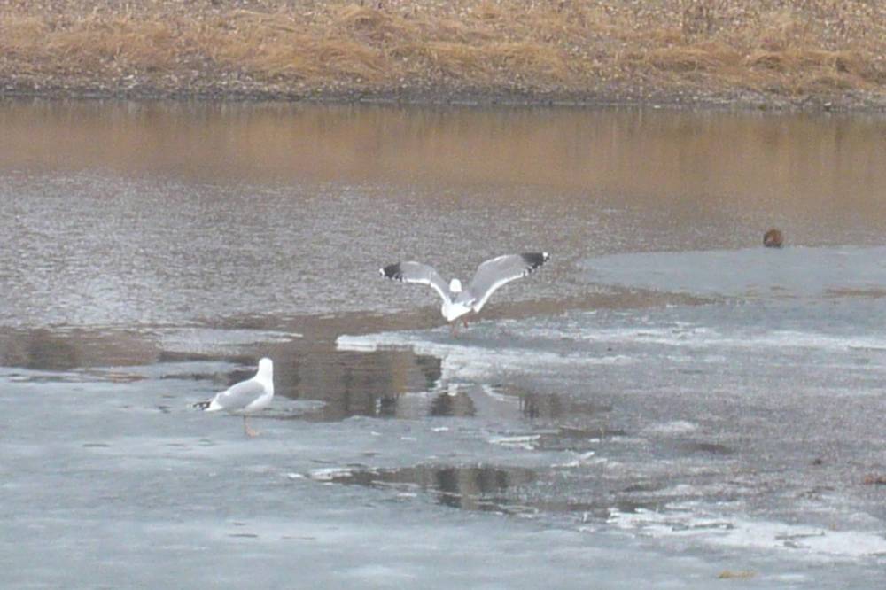 На озерце на острове Татышев мне встретились две чайки, насколько я понимаю, разных видов. Вроде восточно-сибирская и барабинская (прошу специалистов меня поправить). Они не спеша прогуливались по льдине. Чайка с более тёмной мантией сделала облёт над водой и вернулась на лёд. Она нашла что-то съестное и стала долбить лёд, к ней присоединилась чайка со светлой мантией. Затем светлая чайка стала выпрашивать еду у тёмной, и та её угостила. Тёмная сделала ещё круг над озерком и, не найдя ничего вкусного, улетела на Енисей. Вскоре за ней последовала и светлая чайка.