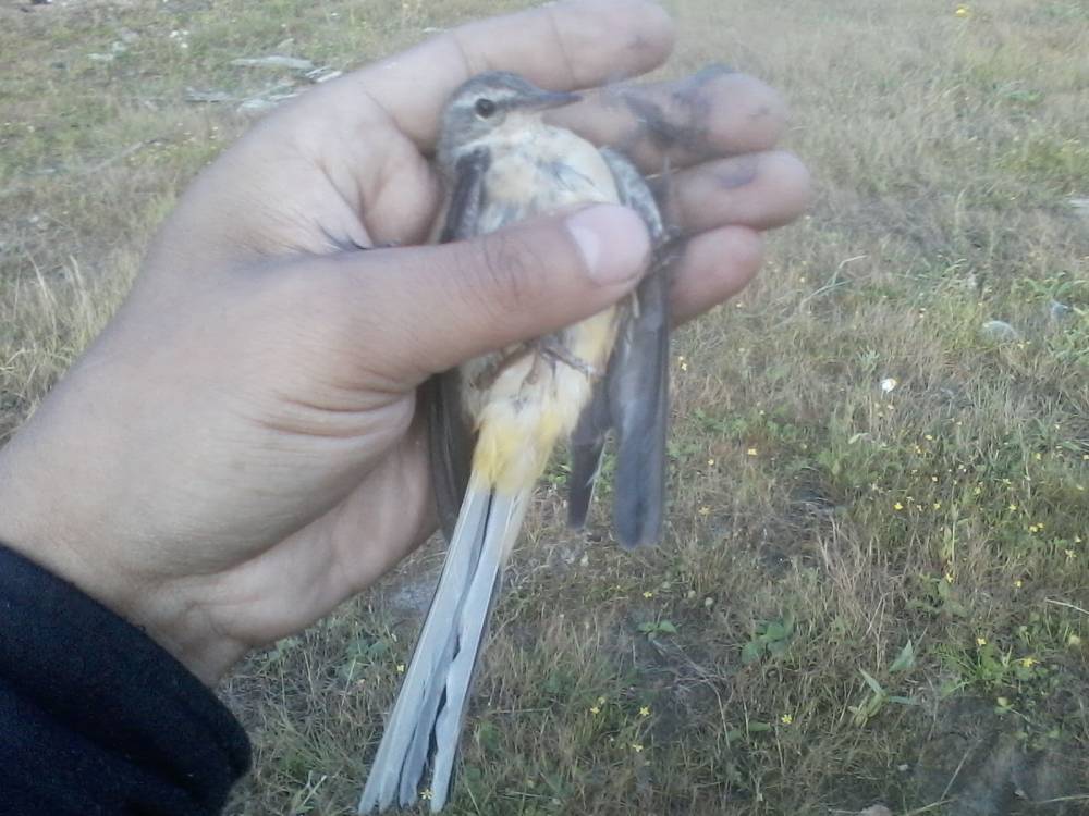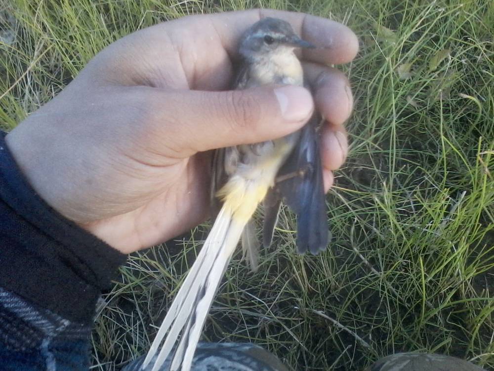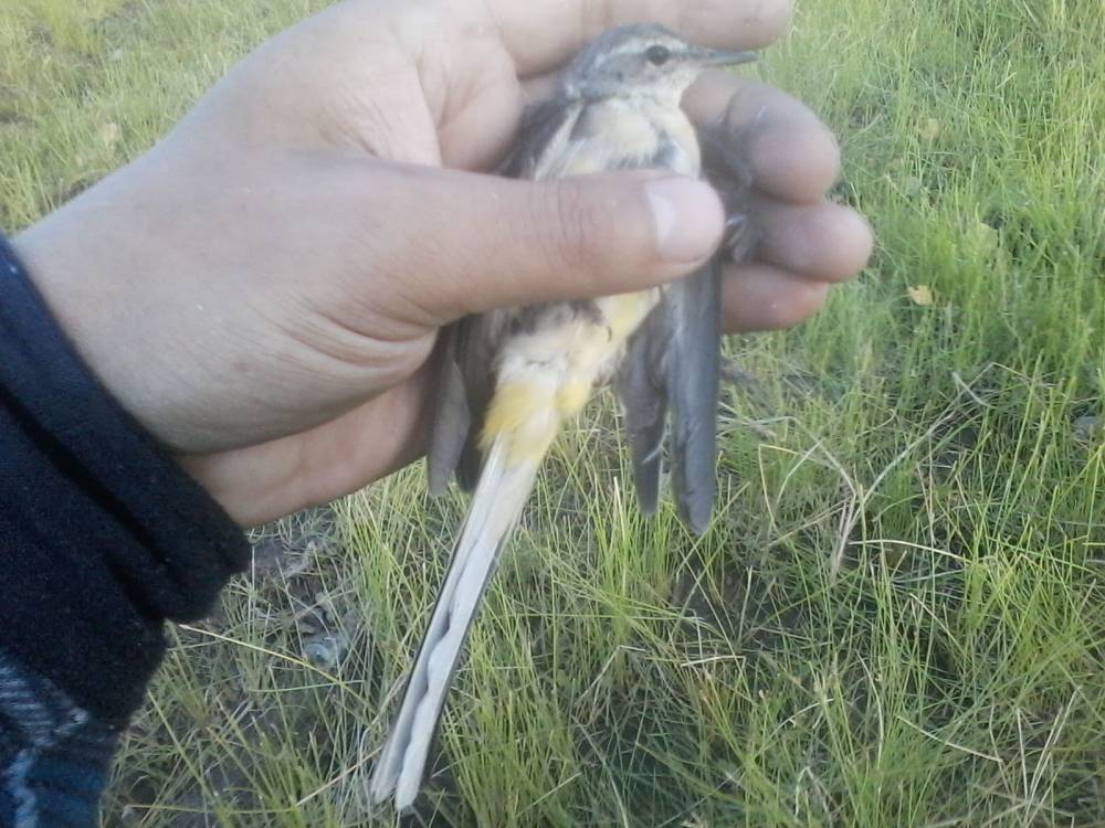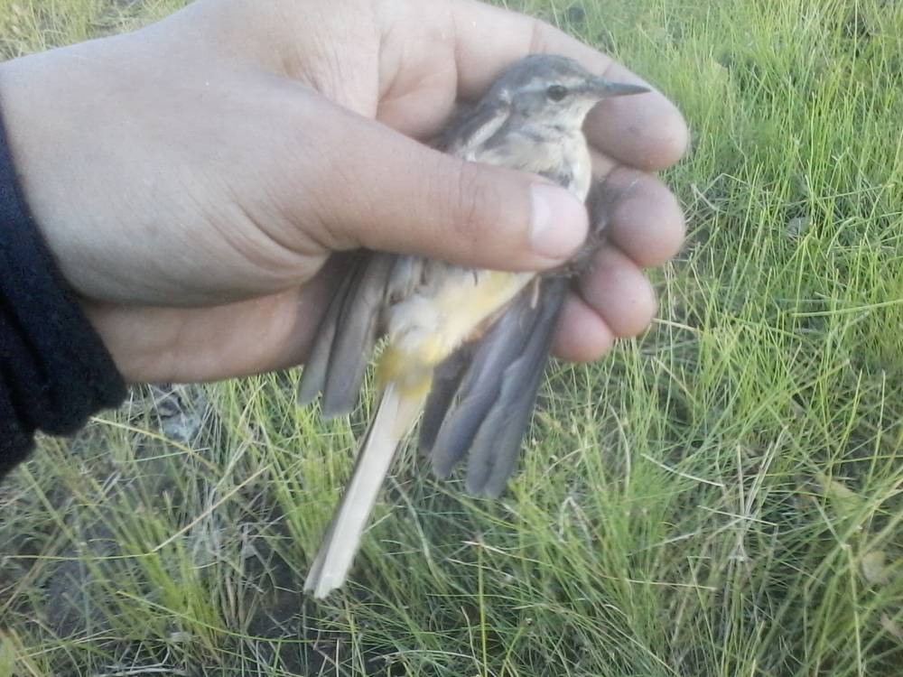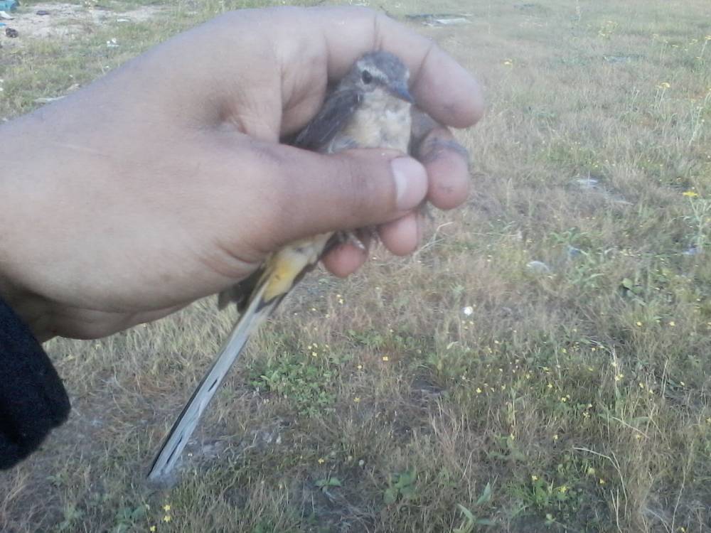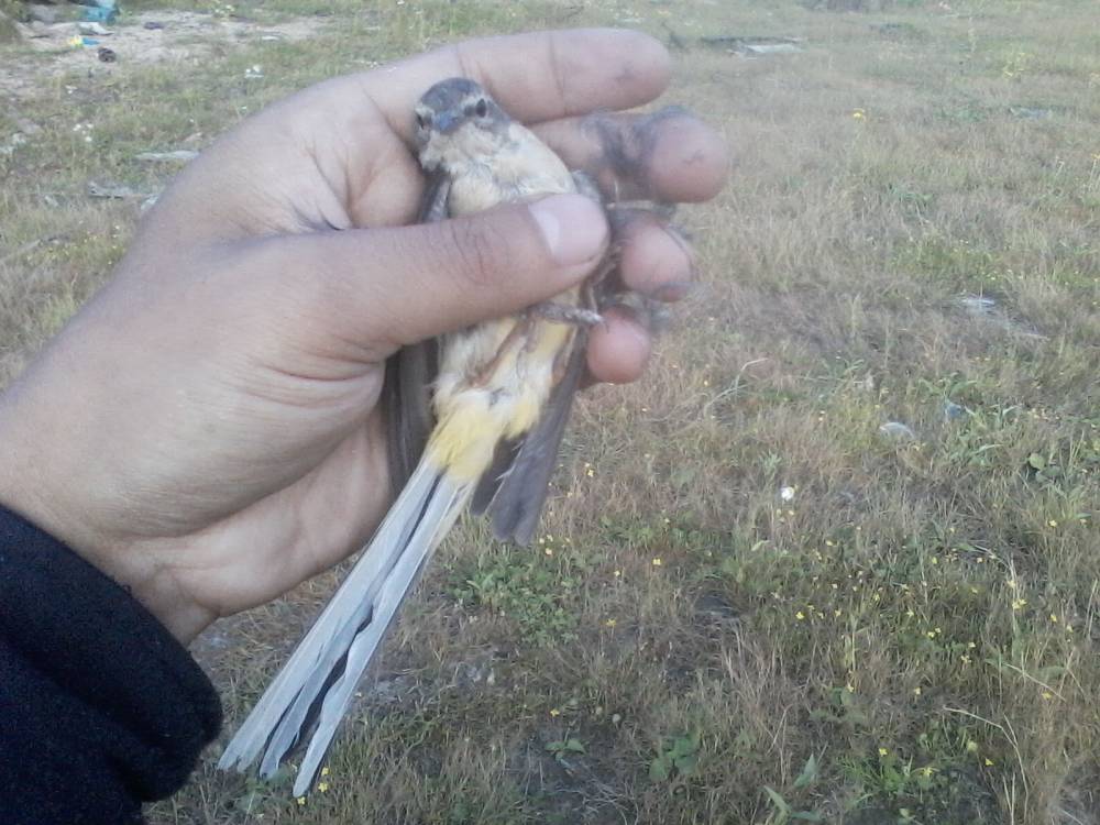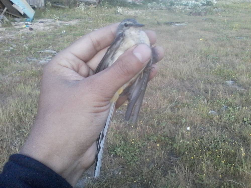 Брошенная на берегу обской губы китайская сетка-запуталась за крыло трясогузка.Это возле нового порта Обской губы.