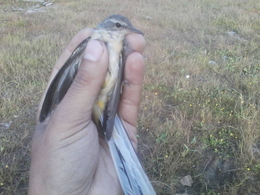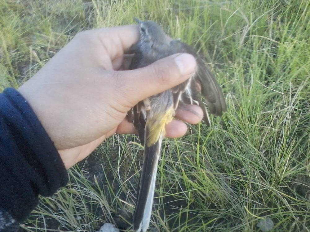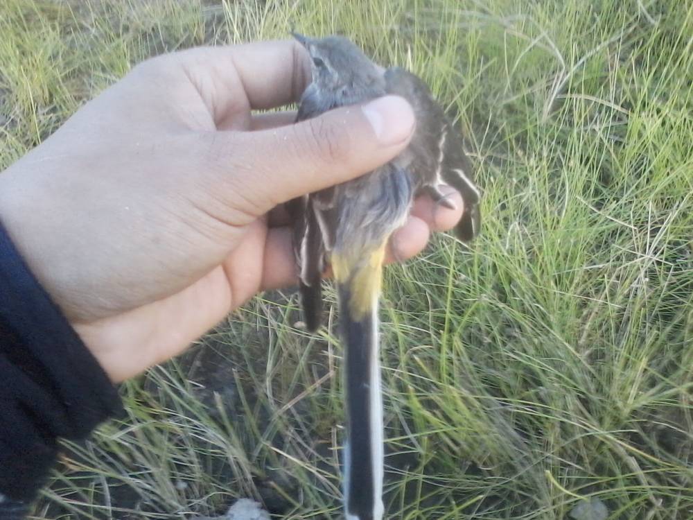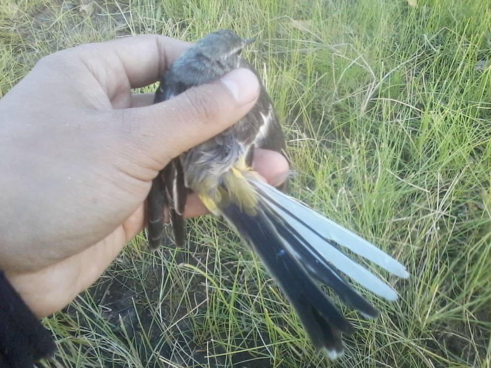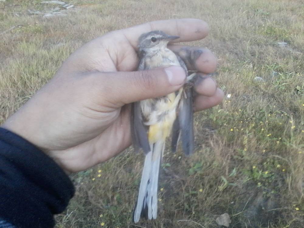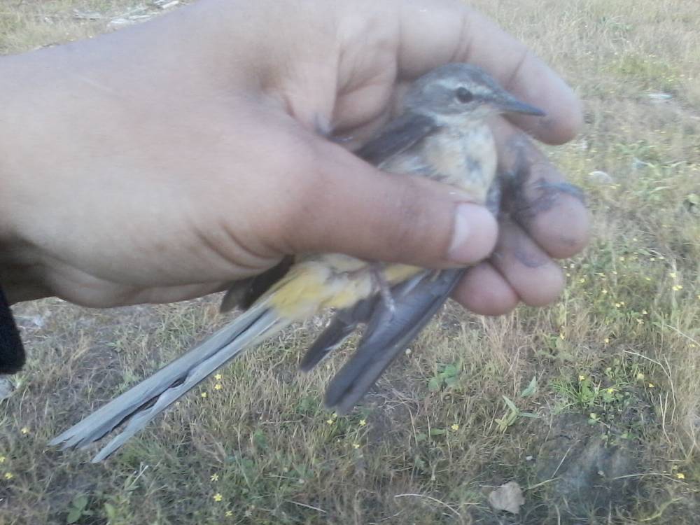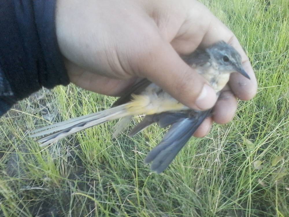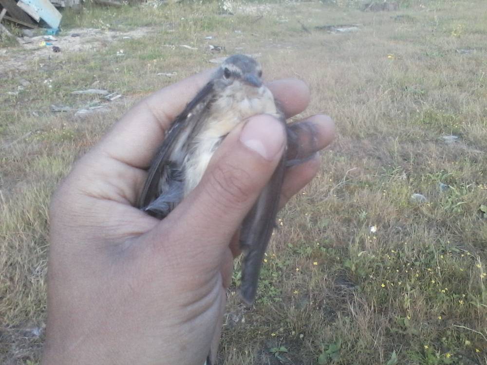 Брошенная на берегу обской губы китайская сетка-запуталась за крыло трясогузка.Это возле нового порта Обской губы.