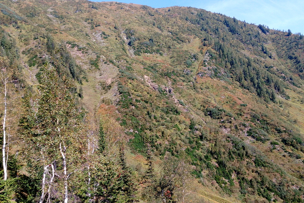 После некоторого поднятия в гору мы достигли смотровой площадки, с которой мы увидели, что гольцы - свободные от растительности скалы, вполне близки и доступны, и я пошел посмотреть есть ли до них тропа. Оказалось, что тропа ведет прямо к гольцам и выходит на седло хребта. Но до этого она трижды пересекает чередование лугов и леса. И перед самым седлом выходит на кедровый (сосновый?) стланник у моренника. Здесь я увидел краснозобых дроздов и седоголовых овсянок. Дрозды очень пугливы, все время прячутся в стланнике. Один самец пролетал мимо и я увидел его яркий красный хвост. Очень красиво. Я не пожалел, что просто смотрел на него, а не стал пытаться сфотографировать, в этом случае, я полагаю, что я бы и снять не успел, и красоту бы толком не разглядел. Мне кажется, что кедровый стланник есть самый интересный здешний биотоп, наподобие наших арчовых склонов с выходами скал. Но сюда надо приходить в июне. Кстати, в двух точках я видел площадки для ночевки, натоптанные тропы к ручьям, и даже монеты, оставленные туристами (вероятно, как пожелание возврата в эти места). Таким образом, лучше всего сюда подниматься в июне, останавливаться на ночлег, и с раннего утра любоваться краснозобыми дроздами, щурами, снегирями и т.д.