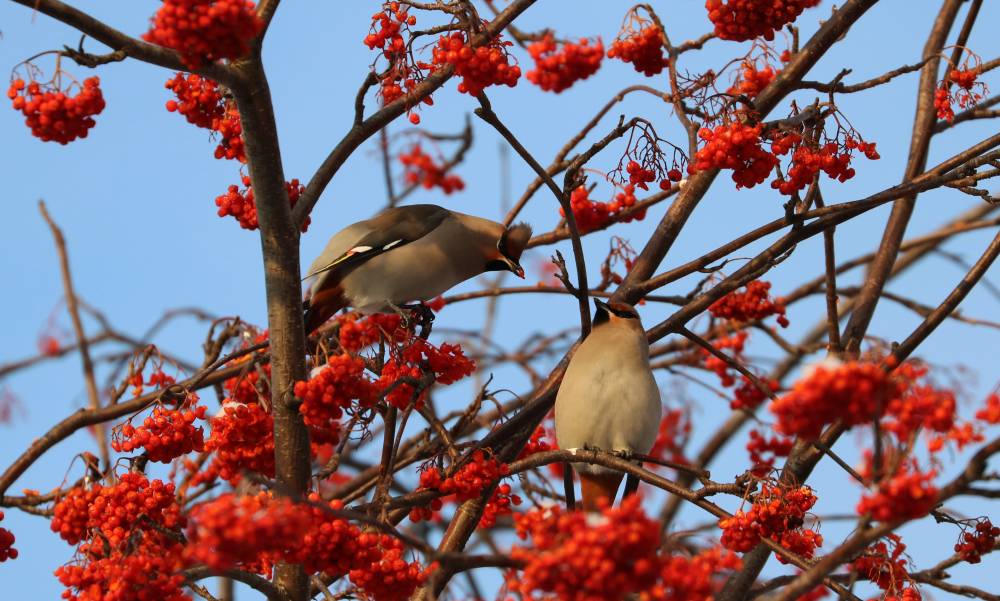 Последний день календарной осени выдался солнечным и теплым. Дачным свиристелям раздолье на рябине. Не сразу обратила внимание на эту парочку. Самец очень старался-обрывал ягоды и приносил их своей подруге; та благосклонно принимала подношение.
