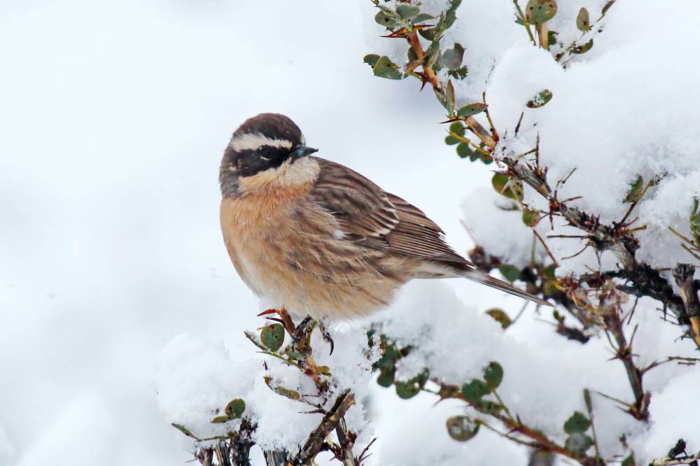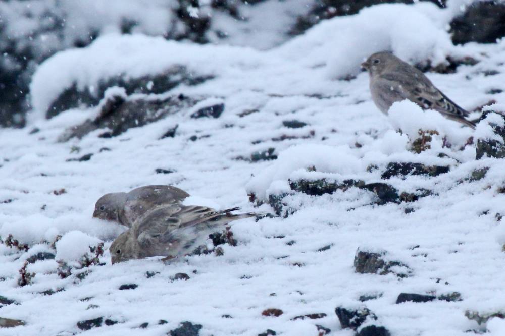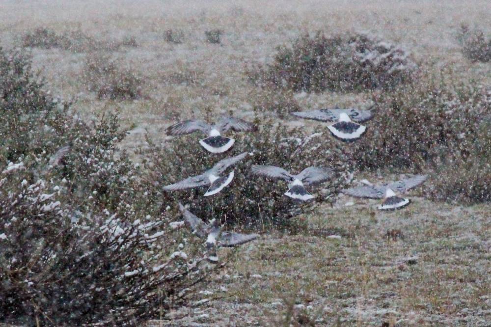 10 сентября. Последний день. Решил сходить к горам, на север, к Курайскому хребту. До ближайшего ущелья от гостиницы около 9 км. По дороге пошел дождь, но, к счастью, скоро он перешел в снег, стало теплее, т.к. суше. Встретил стаю скальных голубей, на этот раз поснимал их во время снегопада. Войдя в ущелье, довольно широкое, обнаружил немало птиц. Горихвостки-чернушки (красноспинных или краснобрюхих не встретил), и целая колония бледных завирушек, которые хорошо попозировали. Еще и гималайская завирушка попалась, и рядом красноухая овсянка. Затем в ущелье появился настоящий лиственничный лес, в нем много мелочи, довольно обычной для равнины.