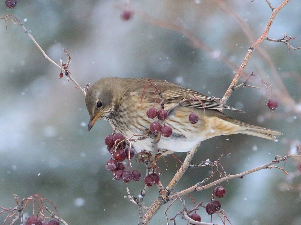Сегодня я пошел в парк около дома посмотреть птиц во время снегопада, и обнаружил стаю чернозобых дроздов, кормящихся на боярышнике. Были в стае и особи смешанного происхождения. Мне они показались довольно интересными, хочу показать их бердвотчерам из Сибири, поскольку это, очевидно, ваши птицы, и могут быть вам интересны. Кроме того, сибирских дроздов вы знаете лучше, может быть где-то меня поправите, может быть, я где-то ошибаюсь в признаках.