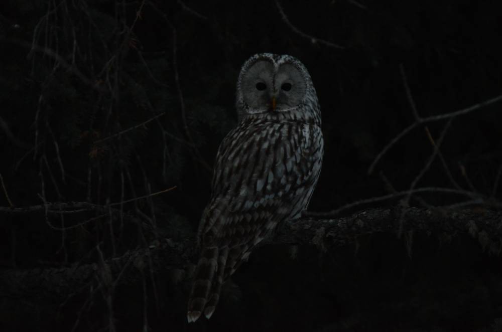Едем далее. После с. Шебалино в кустах видел слетевшего с веток сорокопута (похоже, северного). Доехали до подъёма на Семинский перевал, и на 3ем километре этого подъёма я заметил Длиннохвостую неясыть. Мы слегка затормозили, её пришлось снимать быстро, т.к. там достаточно опасный участок чтобы надолго останавливаться. Далее доехали до Горнолыжного комплекса на самом перевале, света уже почти не было, хотели просто "разведать обстановку". В итоге кроме пары щуров и поползня там я никого не встретил. Доехали до "Золотого Кедра" и заночевали там.