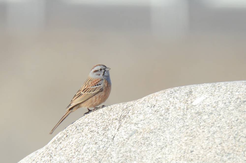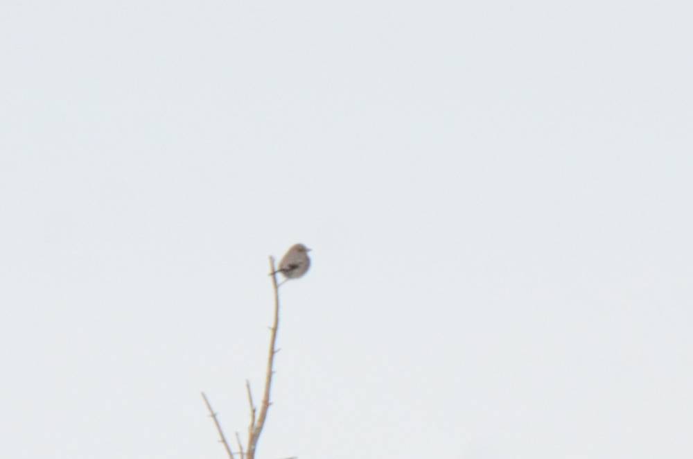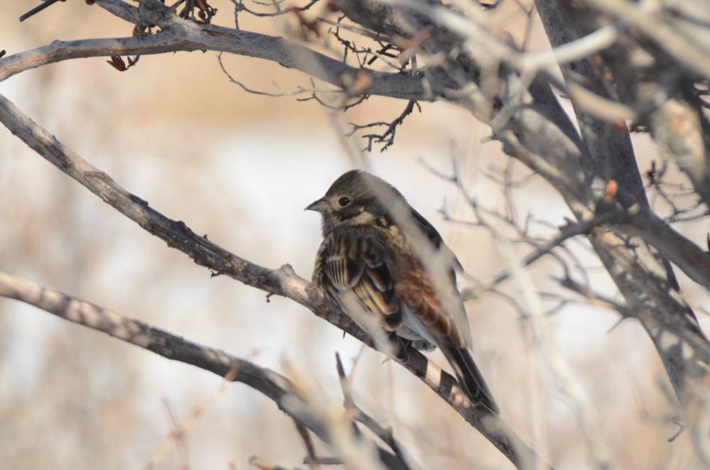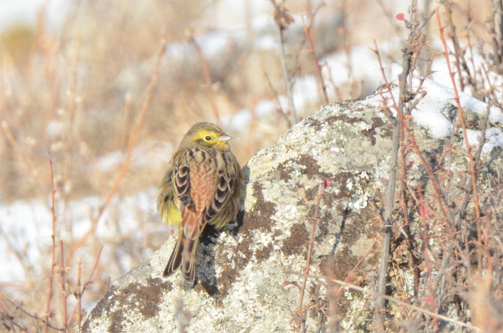 Далее остановились на пригорке за мостом после М. Яломана. Там уже было поинтереснее - снял несколько овсянок Годлевского, классно снял Рогатого жаворонка (их была стайка около 15 особей), и почти сразу мне попалось 2 Красноухие овсянки - лайфер №5! Одну из них снял достойно.