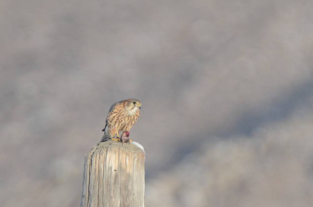 Потом основной бёрдинг был в окрестностях Онгудая (райцентр) - сначала на подъезде к с. Каракол встретился самец Дербника, увы толком не захотевший позировать и слинявший при попытке подхода к нему. Потом после с. Курота на поле возле речки был встречен и снят первый непонятный канюкоид, предположительно, Мохноногий курганник. Потом меня вообще ждал шок, и в самом селе Шашикман возле дороги была встречена огромная стая Сибирских вьюрков (лайфер №4!). Причём здесь мне добрую службу сослужили переходившие дорогу коровы - во - первых, затормозив поток машин, во - вторых, спугнув птиц так, что те сели прямо возле меня. Вдоволь их поснимал, но недолго. В их стае также было около 4ёх Рогатых жаворонков. Далее прям на въезде в Онгудай мне встретился второй непонятный канюкоид, похожий на мохноногого курганника. Ещё через 5 минут езды, в самом Онгудае удалось достойно снять Зимняка, занятого едой и почти не обращавшего на меня внимания.