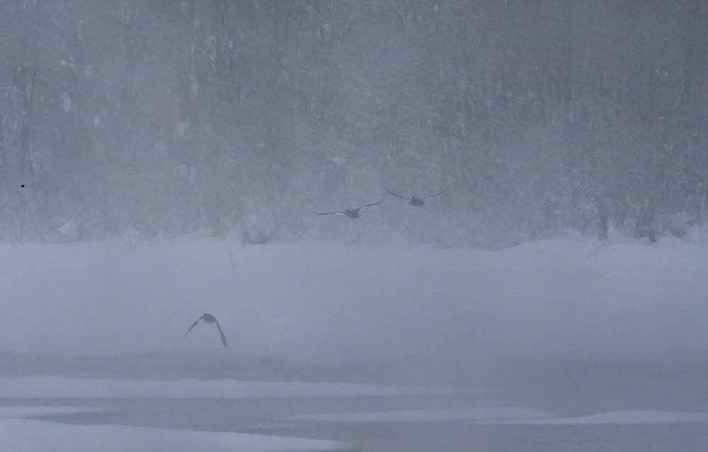 Сегодня опять мороз -34. Днем чуть потеплело. Я наполнила кормушки и спустилась на реку: полынья сильно сократилась в ширину, но в длину еще метров 150. На ледяных кромках штук 6 оляпок. Солнца нет и висит густой серый туман. В этом тумане и старались спрятаться утки. Сегодня их было 3. Меня они почему-то не сильно боялись, потихоньку сплавлялись вниз по течению, ныряли. Когда полынья кончилась, взлетели и переместились в начало протоки. Я насыпала по берегу приготовленную с вечера размоченную пшеницу. В дальнем конце что-то темнело, пошла посмотреть - это был погибший гоголь. Лапки мягкие. Я запустила пальцы в перо и ощутила сильное тепло - сердечко было еще горячее, но уже не билось. Я его спрятала под пуховик (может еще отойдет?) и потопала до машины. Но нет, не отогрелся, хотя синиц я так отогревала. Он был легонький, как пушинка, видимо голодал.