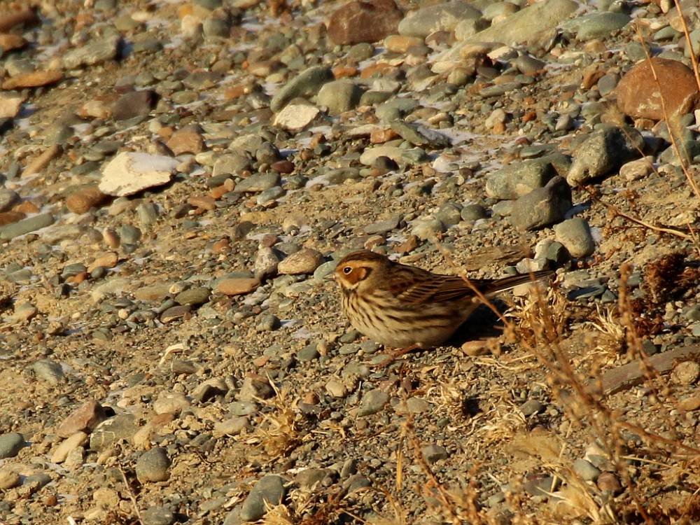 Далее мы двинулись вдоль склонов обширной речной долины в сторону с. Теленгит-Сортогой, где на столбах ЛЭП периодически сидели мохноногие курганники. Во время одной из остановок для фотофиксации курганника на ограде пастбища рядом с автомобилем неожиданно появилась одинокая красноухая овсянка. На открытых склонах периодически встречались стайки рогатых жаворонков, а также были отмечены несколько десятков снежных воробьёв, а у одной из кошар – смешанная стая из полевых, каменных и монгольских земляных воробьёв. Последние были довольно доверчивы и позволили сделать несколько неплохих снимков.