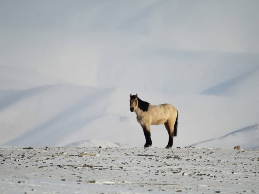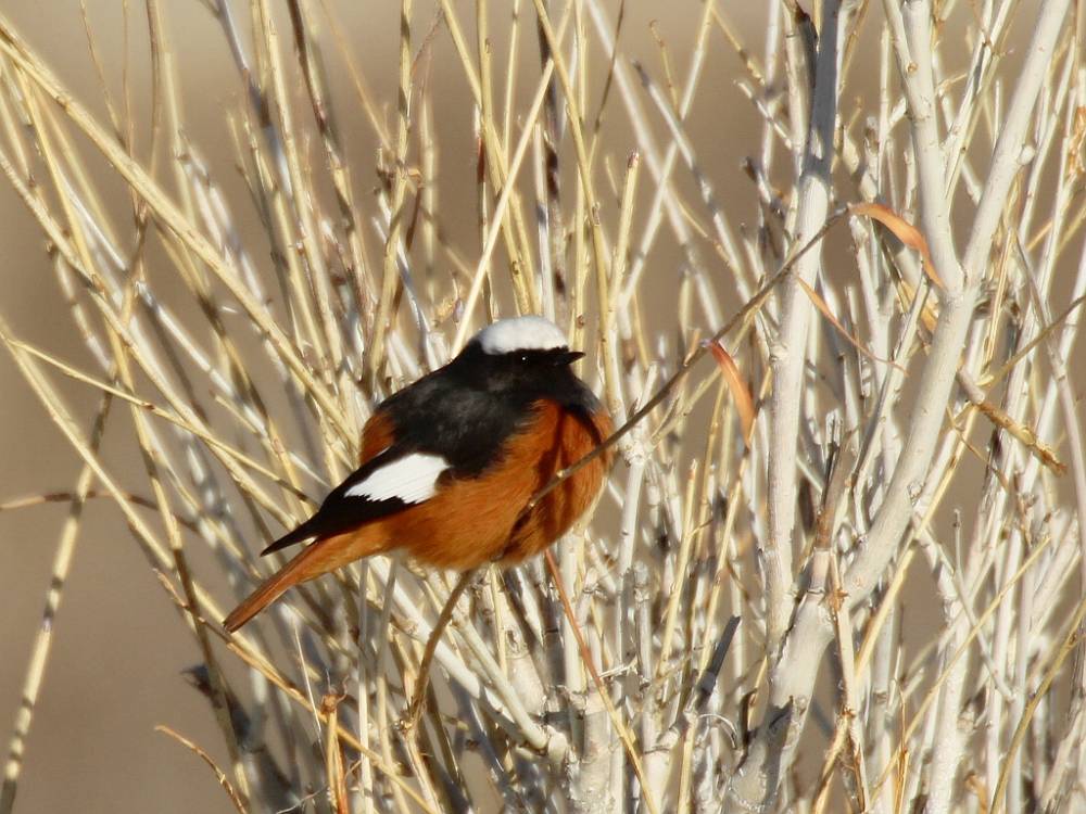 Далее мы проехали по левому берегу р. Талдура до заросших кустарником (в том числе облепихой) островов между многочисленными замёрзшими протоками, где, как и в прошлом году, были встречены краснобрюхие горихвостки (только самцы – всего около 25 птиц, что в 2 раза меньше, чем в прошлом году), князёк, северный сорокопут и дрозд-рябинник. Между кустарниками и пасущимся стадом двугорбых верблюдов держалась небольшая стая клушиц, которых в эту поездку в Чуйской степи было как-то мало.