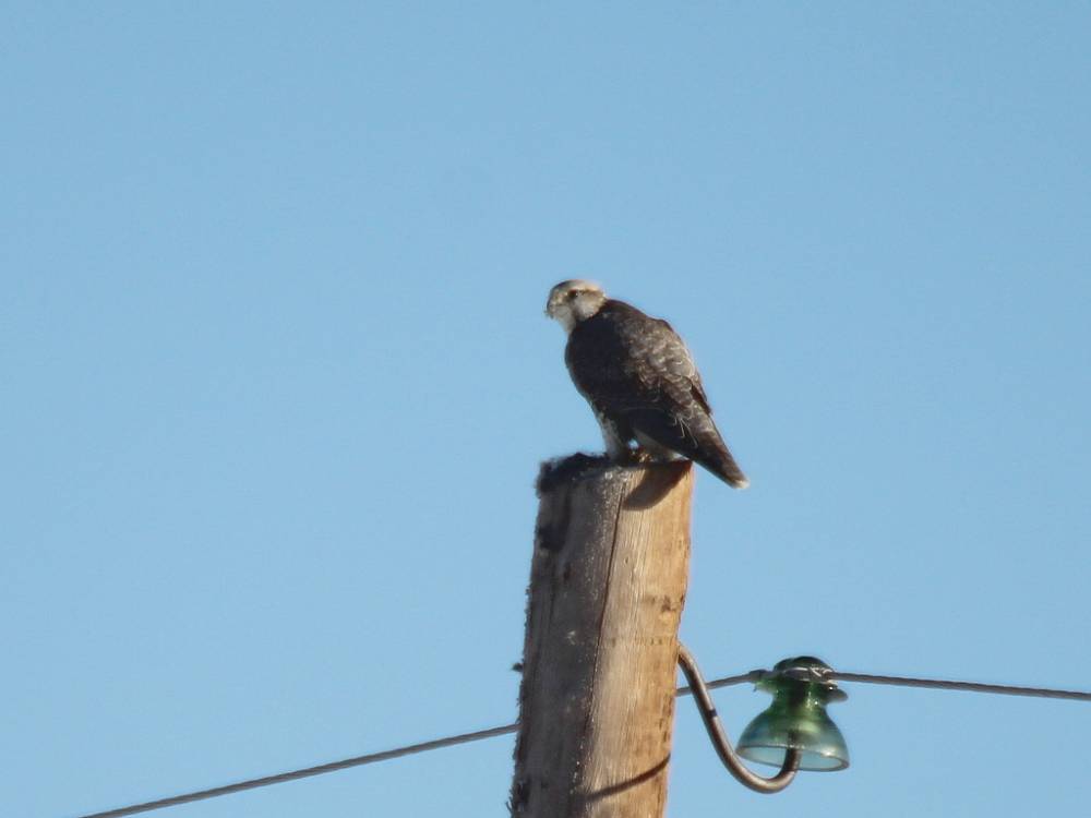 Далее проехали через несколько кошар у подножия горных склонов, окаймляющих южную часть Чуйской степи, где были преимущественно рогатые жаворонки, и вернулись на Чуйский тракт, вдоль которого на столбах ЛЭП сняли нескольких мохноногих курганников и одного шикарного беркута с кольцом на лапе (надеюсь, что хотя бы у кого-то из участников поездки на фото получится рассмотреть данные на нём).