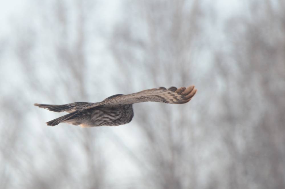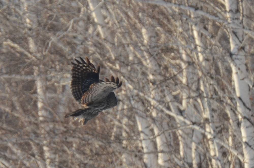 Затем попалась неясыть (тоже Бородатая) на берёзе возле дороги сразу за с. Новотырышкино - снял её в полёте, но снова ничего путного в плане качества не вышло.
