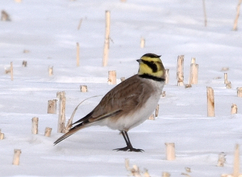 Больше птиц не встречалось до самого Голубево. Проезжая уловила натренированным глазом движение в стерне. Вернулись. Оказалась пара рогатых жаворонков. Просто выставочные экземпляры, отличные от горных собратьев, ярко желтыми масками.