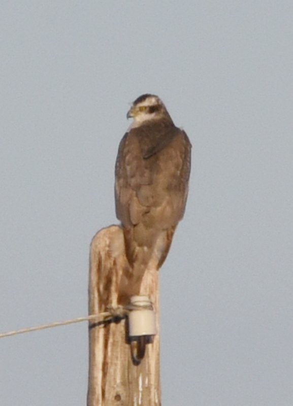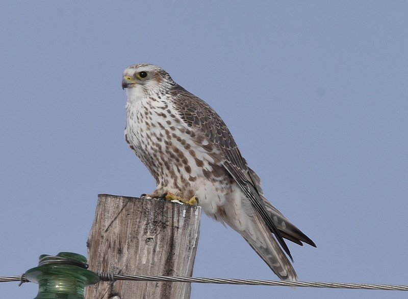 По традиции, не пропустили Степногутово. Заехали, через р. Тарьсьма и за деревней на столбах сразу увидела крупного сокола. На подхвостье тоже есть пестрины но не слишком отчетливые, наверное, это был балобан. Кстати, на обратном пути на следующий день застали его на том же месте.
