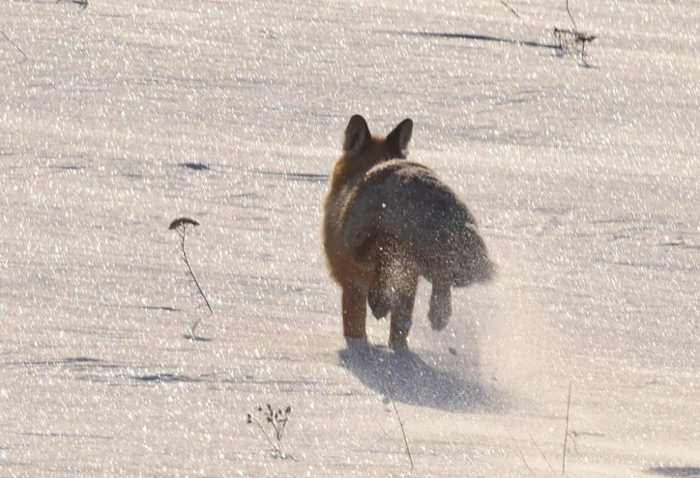 Утром еще раз заехали на дорогу к Буяну, недалеко от Большого лога на столбе у дороги сидел белоснежный мальчик, но общаться с нами не захотел, слетел еще до того, как мы к нему подъехали. Полетел к полосе заиндевелых берез. Я снимала его пока он не нашел равновесие и не уселся на верхней ветке. Улетел метров на 350. Но в окружающем бело-иниевом свете , смотрелся чистым ангелом). У подъема в Буян, дорогу нам перебежал здоровенный пушистый лис, с ослепительно белой манишкой на груди. Жаль, что снять его смогла только против солнца. Связалась с Алиной Боксорн, известным центром притяжения всех бердеров Сибири. К сожалению, Алина заболела, и общались мы с ее бабушкой Галиной Алексеевной, которая сама всем бердерам – бердер. )) Хотели проверить рогоз на предмет усатых синиц. Ночью ударил мороз . – 29 на рассвете. Мороз выдавил воду наверх. Подойти к ручью стало проблемой. Берега залило. Мы обходили залитые места по верху, а дальше по снегоходному следу. Наконец то, смогли выбраться на лед, но метров через 200 уперлись в талую воду, до нас прошли рыбаки в сапогах, поэтому мы не испугались и тоже ее преодолели, но резиновый рант на зимних ботах почти скрылся в воде. А через 50 метров перед нами возникло очередное водное препятствие. Времени у нас не осталось, нужно было возвращаться, чтобы вернуться домой до ночи. Все же 500 километров. Рогоз хранил молчание. Усатки нам не улыбнулись. Но нам было хорошо и без этого счастья. Нагулялись на морозе, надышались свежим воздухом, познакомились с Галиной Алексеевной. Отлично провели выходные.