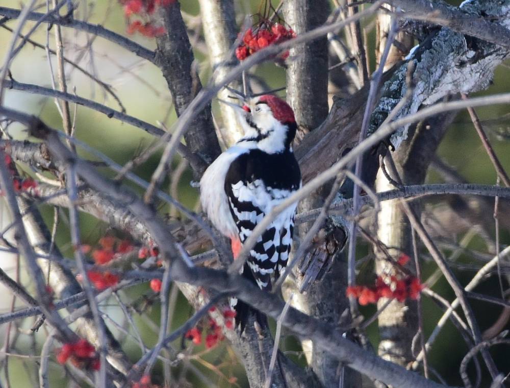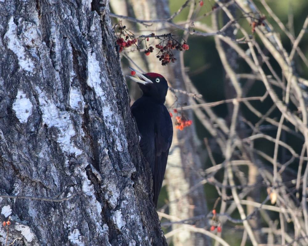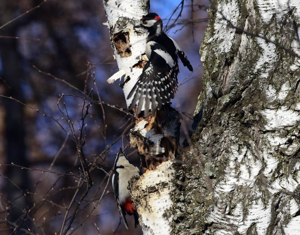 В Заельцовском бору на одном пятачке собрались 4 вида дятлов и не по одной персоне. Состязание развернулось нешуточное: всюду слышались крики, барабанная дробь и шорох крыльев - соперники гоняли друг друга. Временами уставшие претенденты приземлялись на одинокую рябину склевать ягодку-другую или начинали искать козявок в трухлявом дереве. Тут же вертелись любопытные зрители - ополовники, синицы, пухляки и даже белка. Два раза налетали свиристели на рябину, но были изгнаны желной. Пищали где-то наверху снегири. Но больше всех негодовали сороки - суета их чем-то беспокоила.