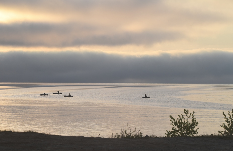 Когда мы вернулись к зимовью, увидели, что наши сопутники уже накипятили чай и хмуро поджидают нас. Была Троица. Праздник. В селе их ждали у накрытых столов. Анисимыч вынул фляжечку с самогоном и мы слегка побурханили. Местная традиция, макаешь щепоть в спиртное и брызгаешь Духам земли и воды, потом пьешь. Саша увидев , что после обрядов нам стало совсем хорошо, сам притащил наши сапоги из дома. Проконтролировал, чтобы немедленно обулись и вместе с отцом впихнули нас в лодку. Правда Саша без капризов довез нас до турпанов, и мы сняли их с воды.