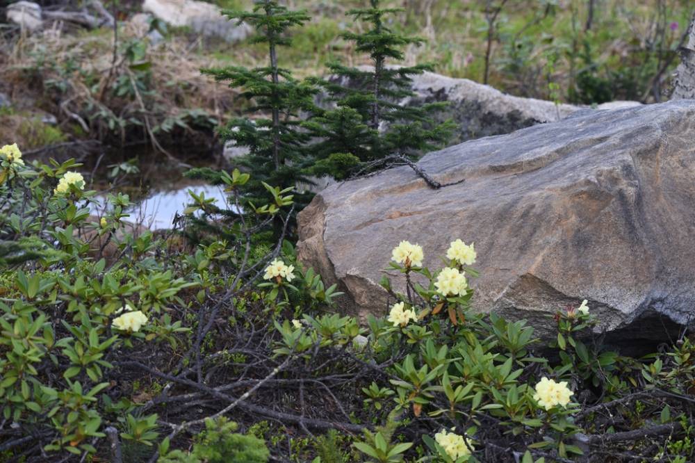 В последний день мы поехали в Душкачан, к человеку с которым в прошлую поездку мы ходили на небольшой яхте вдоль Кичеры и останавливались в Ярках с ночевкой. У Ильи причал с выходом на болото. Ширина болота метров 200 . Это торфяная подвижная подушка, заросшая кедровым стлаником , болотным багульником, подбелом многолистным, малипусенькими кандычками цветущей клюквы, кувшинчиками брусники, цветущей голубицей, княженикой и морошкой. И красные пыльники стланика довершали картину буйного цветения. Мы сидели на покачивающемся торфе, как на воздушной подушке и балдели. Из птичек там были певчие сверчки, дубровники, случайно зацепила бурую пеночку. Болото заканчивалось, и начинался Байкал. Водоплавающие наверное, сидели на гнездах. Никого интересного мы не увидели.