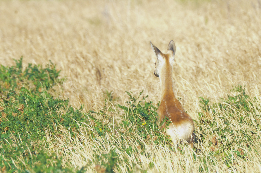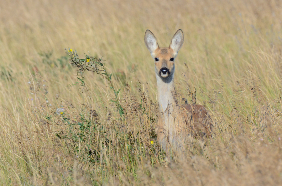 Из травы показались симметричные очертания треугольников. Взглянул в объектив – на меня смотрела Косуля, из травы торчали глаза и уши.) Дождавшись, пока она отвлечётся от меня и продолжит пастись, я подкрался поближе и сделал неплохие кадры. Косуль было две, и судя по рисунку на спине – молодые.